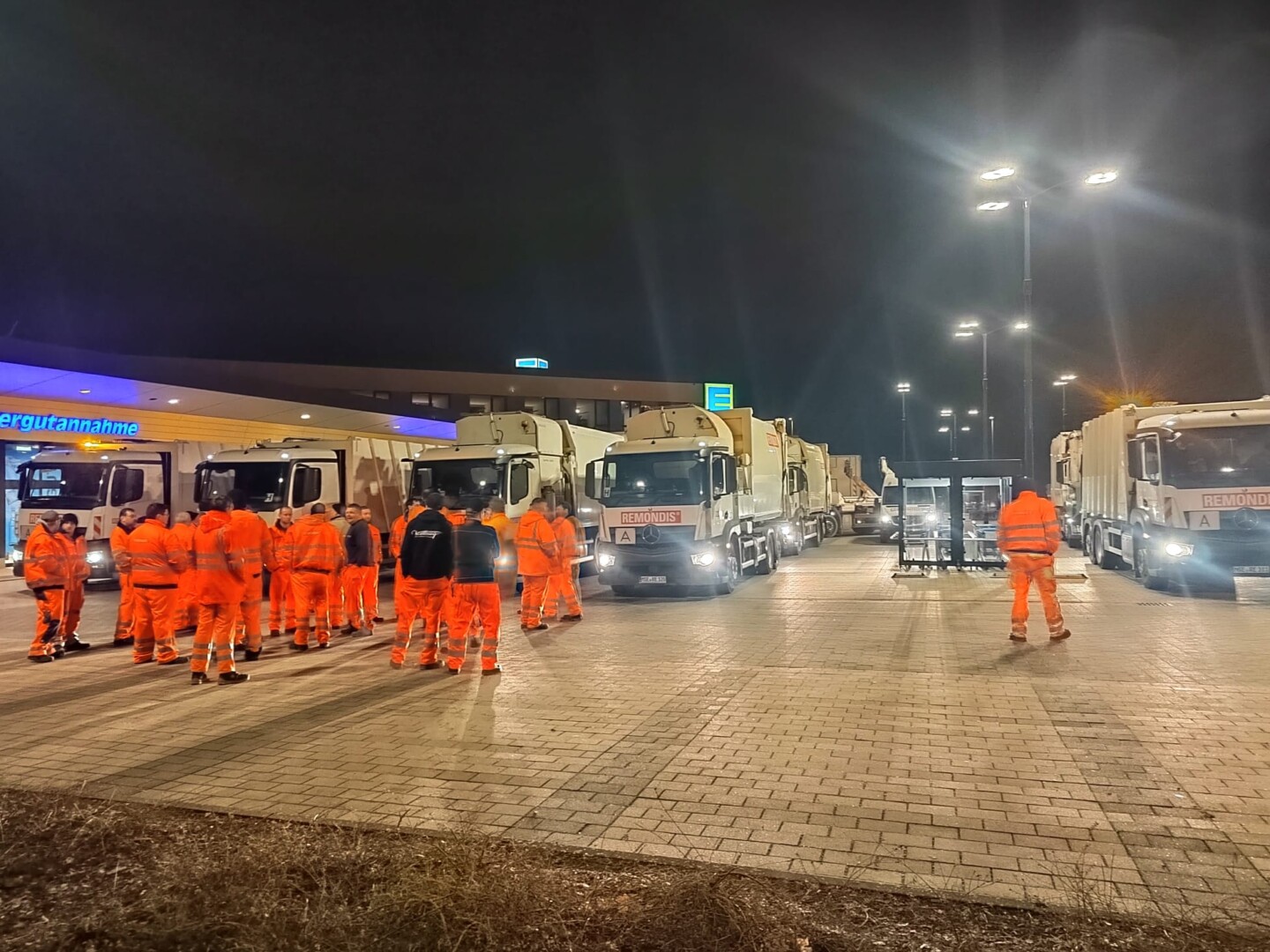 Heute früh kurz nach 7 Uhr in Waren: 24 Fahrzeuge der Entsorgungsfirma Remondis fahren im Korso durch Waren-West. Zuvor hatten sich um die 50 Mitarbeiter auf dem EDEKA-Parkplatz in der Teterower Straße getroffen – mit dabei der Chef persönlich.