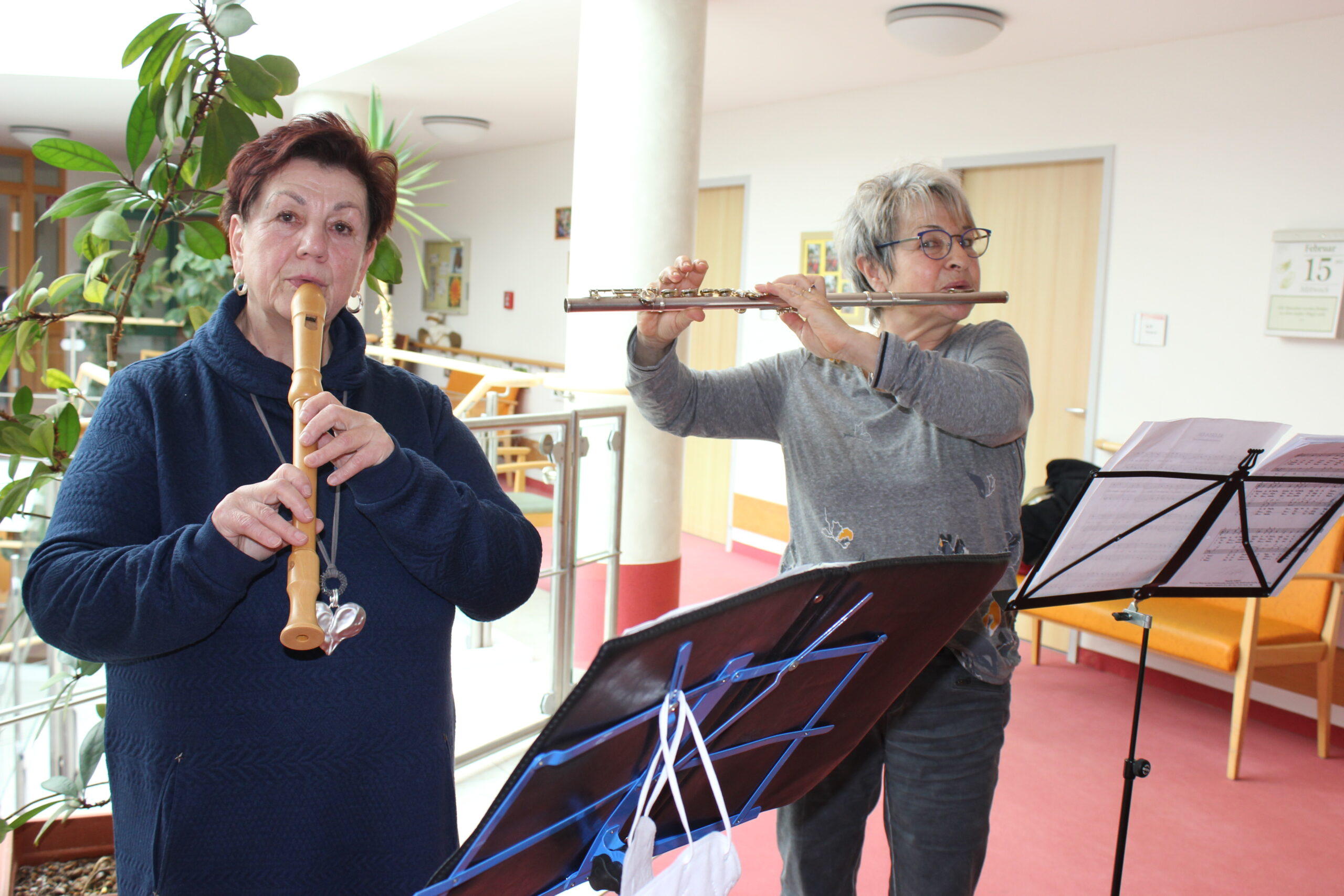 Singen und Musizieren bereichern das Leben der beiden Stavenhagenerinnen Edelgard Hamann und Thea Penz. Sie singen beide im Chor und spielen ein Instrument. Die Freude an der Musik geben die beiden Rentnerinnen gern weiter an die Bewohner des Kursana Domizils. Mit Altblockflöte und Querflöte sind sie als Ehrenamtliche von Zeit zu Zeit mit kleinen Konzerten im Foyer der Einrichtung zu Gast.
