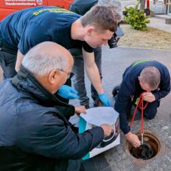 Menschliche Hilfe war gefragt. Das passende Rettungswerkzeug fehlte zunächst, daher wurde die Berufsfeuer zum „Entenangeln“ gerufen. Mit viel Geduld und Geschick gelang es den Kameraden Franz Templin und Simon Peters schließlich, die Entlein binnen weniger Minuten eins nach dem anderen aus dem mehrere Meter tiefen, engen Schacht zu holen. neu.sw Mitarbeiter unterstützten mit Smartphones zum Ausleuchten und zur Imitation von Stockentenrufen.
