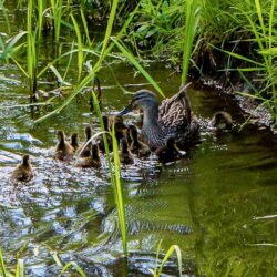 Nummer Acht der getrennten Entenfamilie brauchte etwas länger, um den improvisierten „Fahrstuhl“ zu besteigen. Schließlich konnte aber auch dieses Küken geborgen und die Kleinen wieder mit der übrigen Familie zusammengeführt werden. Auf dem Gätenbach schwammen alle gemeinsam davon.