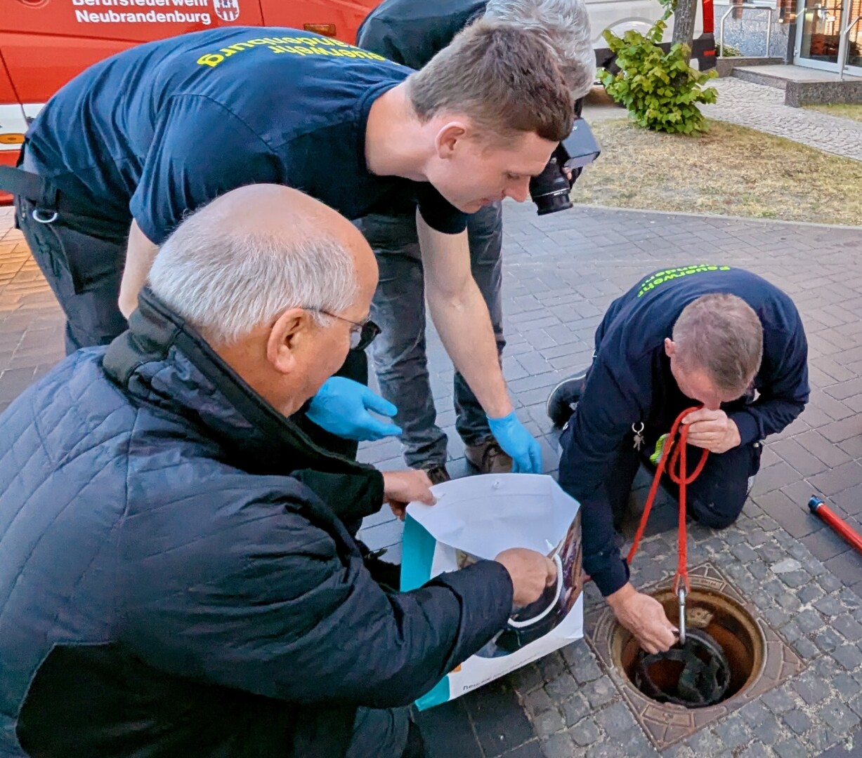 Menschliche Hilfe war gefragt. Das passende Rettungswerkzeug fehlte zunächst, daher wurde die Berufsfeuer zum „Entenangeln“ gerufen. Mit viel Geduld und Geschick gelang es den Kameraden Franz Templin und Simon Peters schließlich, die Entlein binnen weniger Minuten eins nach dem anderen aus dem mehrere Meter tiefen, engen Schacht zu holen. neu.sw Mitarbeiter unterstützten mit Smartphones zum Ausleuchten und zur Imitation von Stockentenrufen.