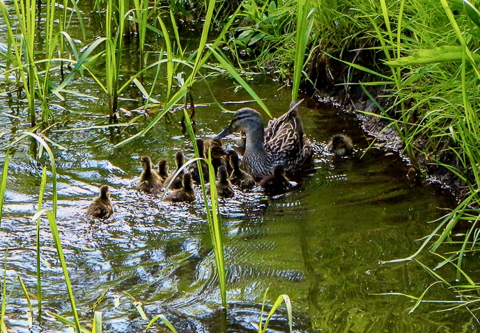 Nummer Acht der getrennten Entenfamilie brauchte etwas länger, um den improvisierten „Fahrstuhl“ zu besteigen. Schließlich konnte aber auch dieses Küken geborgen und die Kleinen wieder mit der übrigen Familie zusammengeführt werden. Auf dem Gätenbach schwammen alle gemeinsam davon.