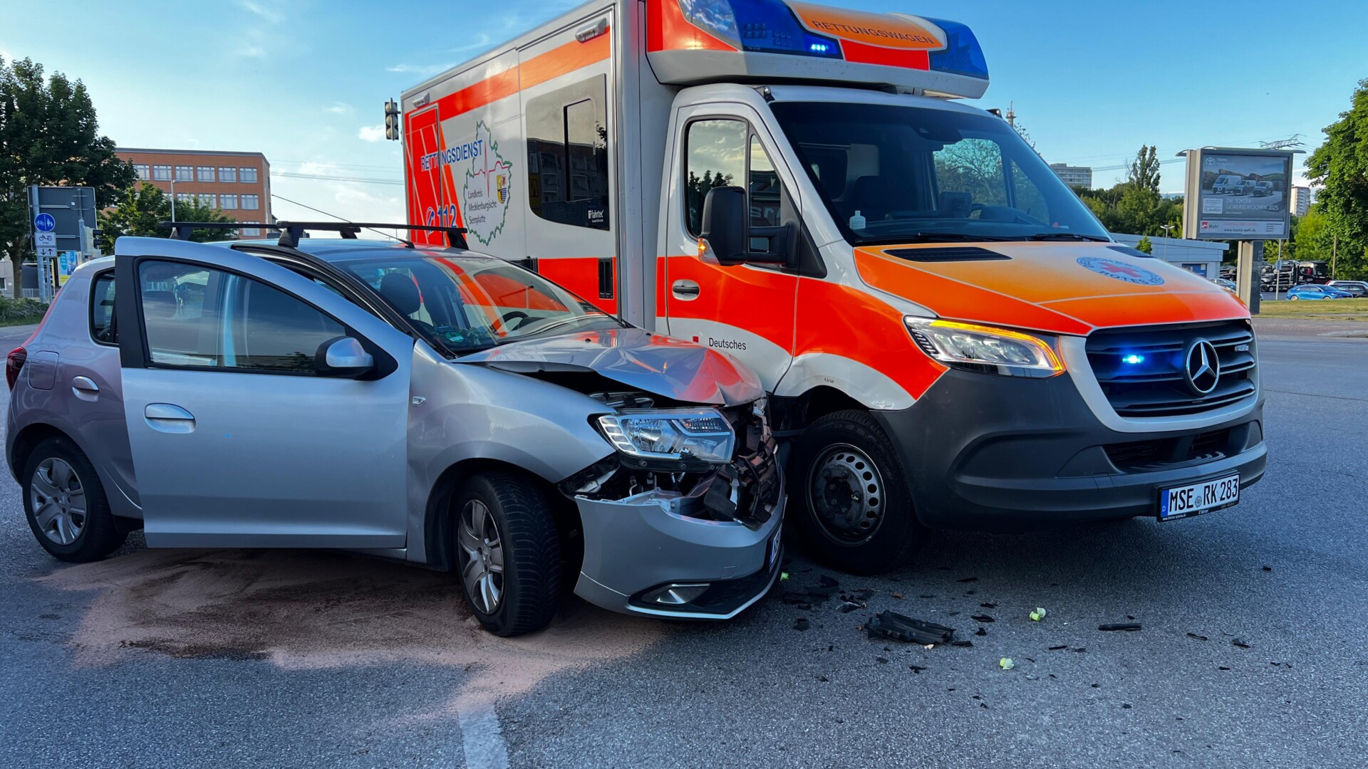 In der Demminer Straße in Neubrandenburg sind gestern Abend ein Auto und ein Rettungswagen zusammengestoßen. Der Rettungswagen fuhr laut Polizei unter Nutzung von Blaulicht und Sondersignal stadteinwärts. Aus dem Ponyweg wollte ein 80-jähriger Autofahrer, für den die Ampel „grün“ zeigte, geradeaus in die Usedomer Straße fahren. Er nahm den Rettungswagen zu spät wahr, so dass es zu einem seitlichen Zusammenstoß kam. Der Fahrzeugführer, seine 79-jährige Ehefrau und auch die beiden 40- und 47-jährigen Notfallsanitäter wurden verletzt und ins Klinikum Neubrandenburg gebracht. Der entstandene Sachschaden wird auf rund 25.000 Euro geschätzt.