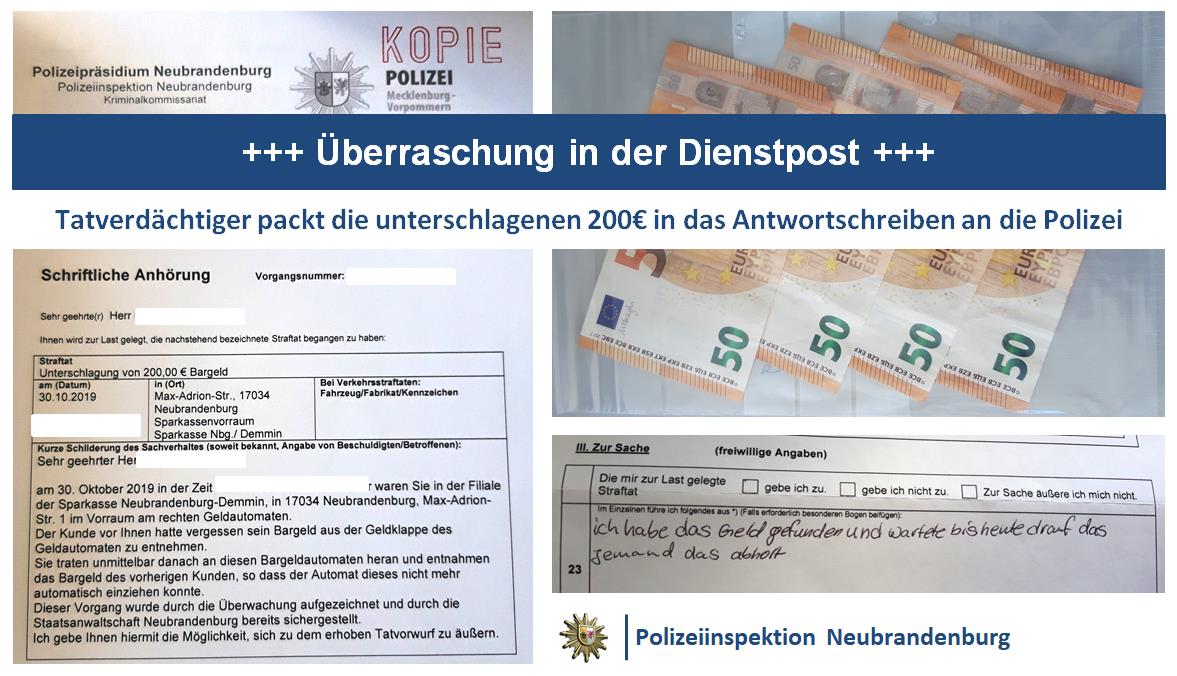 Geht doch! Auch kleine Fälle werden von den Kriminalisten unseres Landkreises nicht vergessen oder einfach ad acta gelegt. Ein schönes und noch dazu erfolgreiches Beispiel dafür ist Kripobeamter Mario. Er ermittelte, nachdem ein Kunde in der Neubrandenburger Sparkasse vergessen hat, sein abgehobenes Geld mitzunehmen. Ein nachfolgender Kunde nahm es aus der Klappe, so dass der automatische Einzug des Geldes auch nicht griff.