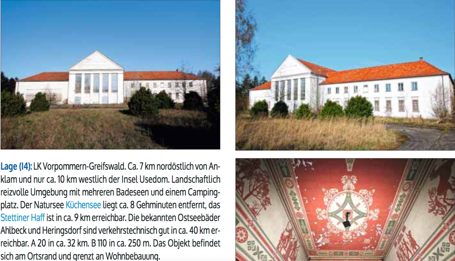 Außerdem wurden ein kompletter Gutshof in der Mecklenburgischen Schweiz bei Altkalen und eine Insel in der Uecker bei Eggesin versteigert. Der Gutshof mit Park und Obstgarten liegt am Kämmericher Hofsee bei Altkalen, umfasst 16 000 Quadratmeter Fläche, ein saniertes Gutshaus und ging für das Mindestgebot von 398 000 Euro über den Tisch.