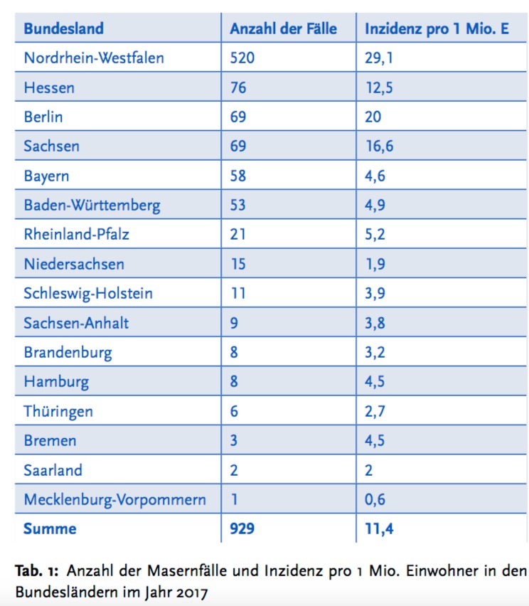 Für das Jahr 2017 gingen am Robert-Koch-Institut Daten von 929 Masernfällen ein. Die weitaus höchste Fallzahl wurde aus NRW mit 520 Masernfällen (56% aller Fälle) übermittelt. Ferner waren besonders Hessen, Berlin und Sachsen, Bayern und Baden-Württemberg betroffen. Sieben Bundesländer wiesen allerdings auch weniger als 10 Fälle im gesamten Jahr 2017 auf.