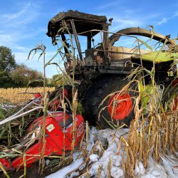 Auf einem Feld bei Röbel ist am Nachmittag ein Maishäcksler in Brand geraten. Thorsten Revens (52) hatte gerade damit begonnen, sein rund 205 Hektar großes Maisfeld abzuernten. Plötzlich bemerkte Revens, dass Flammen aus seinem Häcksler schlugen. Er stoppte die Maschine und versuchte, mit einem Feuerlöscher den Entstehungsbrand zu löschen – vergeblich.