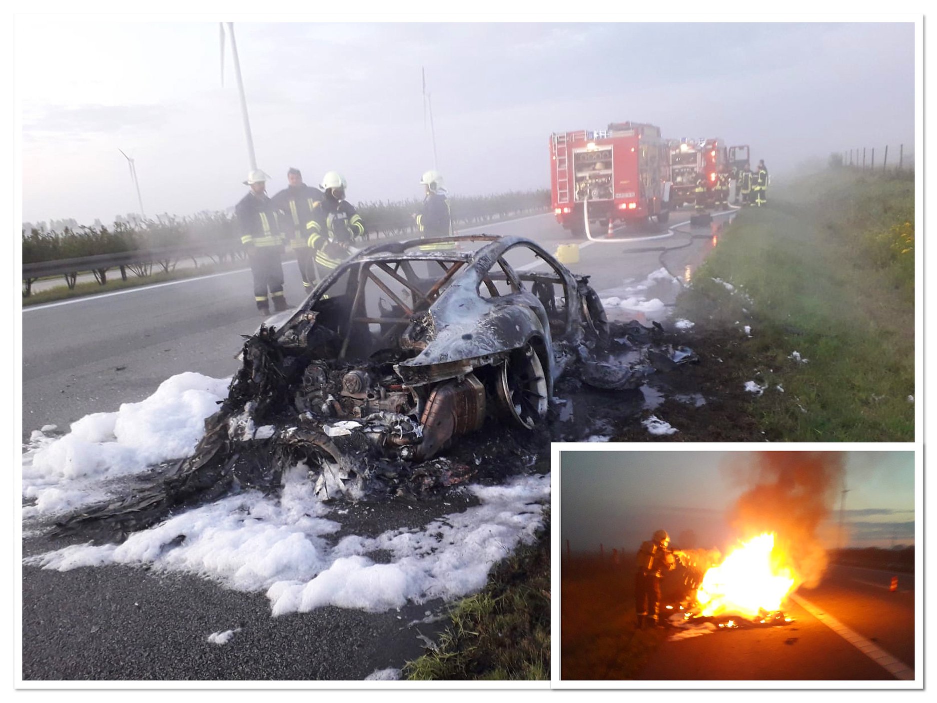 Heute Morgen um 4:33 Uhr rückten die Kameraden der Feuerwehren aus Röbel und Bütow zu einem Pkw-Brand aus. Auf der Autobahn 19 in Fahrtrichtung Wittstock stand ein Porsche 911 GT3 lichterloh in Flammen. Der 46-jährige Mann aus Waren konnte seine Luxuskarosse noch rechtzeitig auf den Standstreifen fahren, ehe das Fahrzeug in Flammen aufging. Trotz des schnellen Eingreifens der Feuerwehren konnte der Porsche nicht mehr gerettet werden.