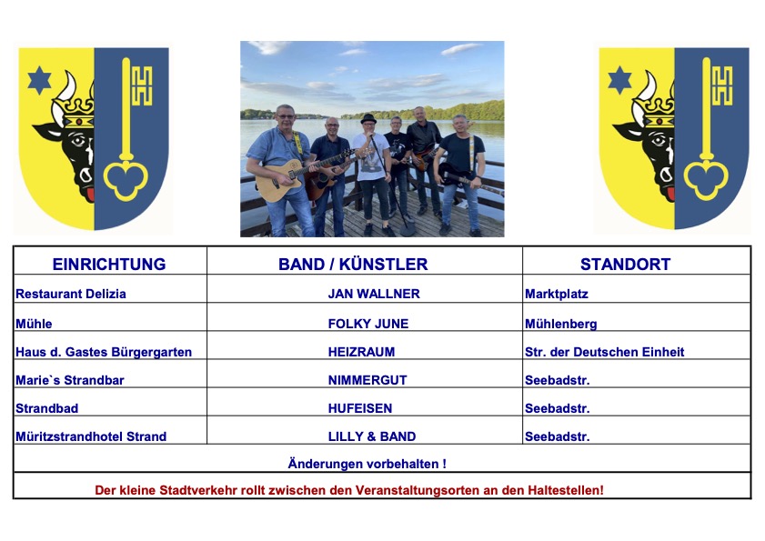 Am kommenden Freitag, 2. September, heißt es von 20 bis 24 Uhr wieder „Röbel LIVE“ – Die beliebte musikalische Kneipenmeile geht in die nächste Runde. Mit dabei sind sechs Bands/Musiker in sechs verschiedenen Einrichtungen.