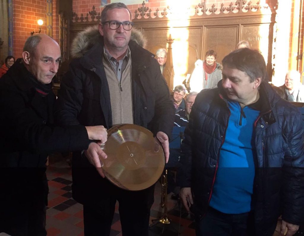 Wenn der Wind in Röbel künftig eine Melodie spielt, könnte es an der St.-Nicolai-Kirche liegen. Denn die vergoldete Kugel des Kirchturms hat seit gestern einen ganz besonderen Inhalt: Eine Vinyl-Schallplatte aus dem Röbeler CD-Werk.