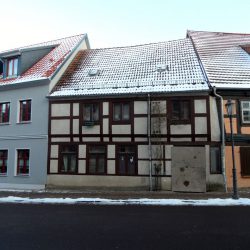 Schon während der Sanierung stockte mancher Schritt. Denn das Bauwerk wurde bis auf das Fachwerkskelett freigelegt, um die notwendigen Reparaturen vorzunehmen. Ein erschütternder Anblick. Nichts für schwache Nerven. Dabei hatten früher die vorgesetzten Holzbretter der DDR-Scheinfachwerkfassade vor dem echten Fachwerk das Haus eher attraktiv erscheinen lassen. Mit der Sanierung des benachbarten „ältesten Hauses“ wurde es zur grauen Maus mit Hoffnungspotential degradiert. Als der andere Nachbar auch noch in neuer Gestalt erstand, wirkte es schon fast schäbig und die Bauschäden wurden immer deutlicher.