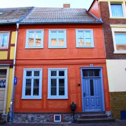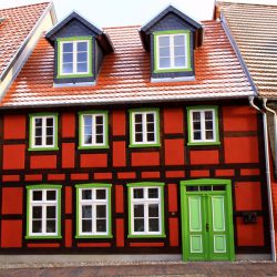 Dieses Haus in der „bunten Stadt am kleinen Meer“ hat das Stadtmotto zum Gestaltungsprogramm erhoben. Mit den roten Ausfachungen zu den grünen Fensterumrahmungen haben sich die Bauherren mutig für Komplementärfarben entschieden. Ergänzt mit dem frischen Weiß zaubert diese starke Farbfreude ein Lächeln auf die Gesichter der Passanten. Viele bleiben stehen, um es auf sich wirken zu lassen und ein Foto zu machen.