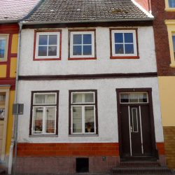 In seiner alten Gestalt hat sich vielleicht mancher Betrachter gefragt, warum dies ein denkmalgeschütztes Haus ist. Ein hässlicher Keramiksockel und der fassadenverhüllende Rauputz gaben wenig Hinweise auf die verborgene Fachwerkschönheit Mit der Sanierung des Nachbarn wurden dann die gleichen Bauformen der Fensterformate, der Tür und des für Fachwerk typischen Absatzes in der Fassade schon deutlicher.
