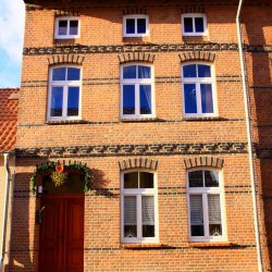 Es gibt in Röbel nur wenige historische Backsteingebäude. Noch seltener wird eine Backsteinfassade saniert, da die Dauerhaftigkeit des Materials dies nicht unbedingt erfordert. Die offensichtlichste Veränderung ist für die meisten Betrachter deshalb in den schönen und schlichten Holzfenstern gegeben. Sie sind tatsächlich mit Bogen und konsequent senkrechter Teilung ausgeführt. Die perfekten senkrechten Achsen werden dadurch betont.