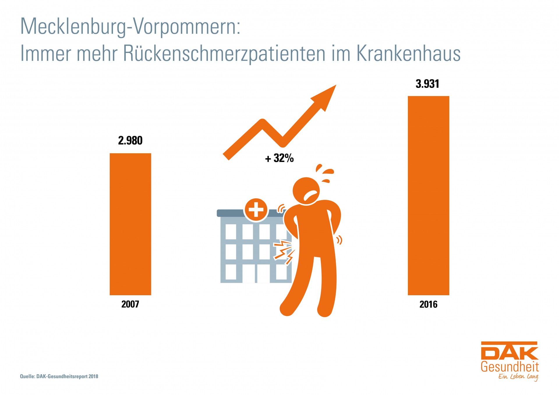Die Problematik spiegelt sich auch in der stationären Behandlung wider: Mecklenburg-Vorpommern hatte 2016 mehr als 3.900 Krankenhausfälle wegen Rückenschmerzen, ein Anstieg um fast ein Drittel in den vergangenen neun Jahren. Der DAK-Report untersucht erstmals detailliert, wie Rückenschmerzpatienten in die Klinik kommen. Fazit: 57 Prozent der Betroffenen wird als Notfall aufgenommen – bundesweit waren es nur 46 Prozent.
