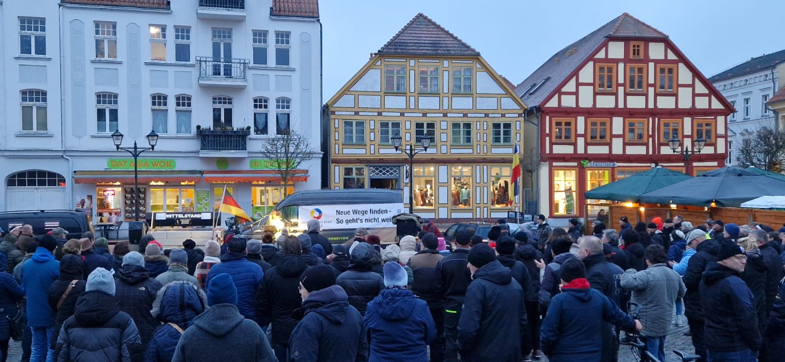 Unter dem Motto „Neue Wege finden – So geht’s nicht weiter“ hat der neu gegründet „Unternehmer Bund Müritz“ am Freitag zu einem ersten Treffen auf den Neuen Markt in Waren eingeladen. Trotz Wind und Nieselregen versammelten sich rund 250 Müritzer auf dem Platz und hörten Beiträge von verschiedenen Rednern sowie Live-Musik. Der „Unternehmer Bund Müritz“ ist aus dem „Müritzer Unternehmeraufstand“ hervorgegangen und will Anlaufstelle für Landwirte, Handwerker, Einzelhändler, Gastronomen, Pflegedienste, Gewerbetreibende, Unternehmer und produzierendes Gewerbe sowie Privatleute sein. Und so war das Publikum am Freitag auch bunt gemischt.
