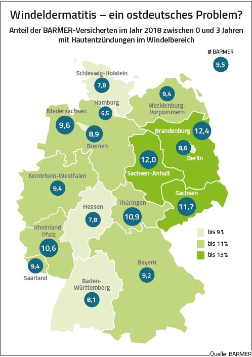 Wie aus der BARMER-Analyse weiter hervorgeht, wird die Windeldermatitis verstärkt in den ostdeutschen Flächenländern ärztlich diagnostiziert. Bei den BARMER-versicherten Kindern zwischen 0 und 3 Jahren kam sie im Jahr 2018 zu 12,4 Prozent in Brandenburg, zu 12,0 Prozent in Sachsen-Anhalt, zu 11,7 Prozent in Sachsen und zu 10,9 Prozent in Thüringen vor. Die geringsten Betroffenenraten gab es in Hamburg mit 6,5 Prozent, sowie Schleswig-Holstein und Hessen mit jeweils 7,8 Prozent. „Die massiven regionalen Unterschiede im Auftreten der Windeldermatitis sind rein medizinisch nicht erklärbar. Dass der Anteil der betroffenen Kleinkinder in manchen Bundesländern fast doppelt so hoch ist wie in anderen, lässt Fragen offen“, sagt Petzold.