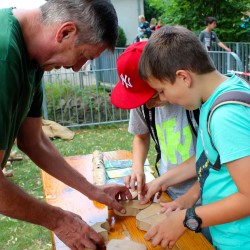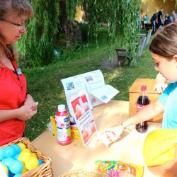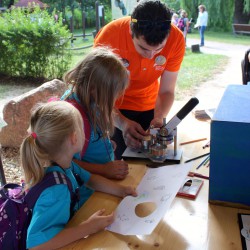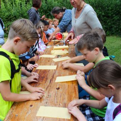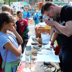 Da zeigt der Imker, wie die Bienen leben und arbeiten und was aus ihrem Honig alles entsteht, da krabbeln Wassertiere über Kinderhände, da kommt man Vögeln und anderen Tieren mit dem Fernrohr ganz nah, da wird auf dem Feuer steinzeitlich Müsli hergestellt, da werden Felle erfühlt und Spuren verfolgt und da gibt’s auch Infos zu Cola und Co., insbesondere zum Zuckergehalt von Lebensmitteln.