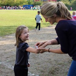Das Highlight des Tages bildete aber der Sponsorenlauf. Jede Klassenstufe hatte eine Unterrichtsstunde Zeit, so viele Runden wie möglich auf dem Sportplatz zu laufen. Für jede Runde bekamen die Läufer einen Stempel auf ihren Arm. Die Kinder wuchsen über sich hinaus und präsentierten schließlich voller Stolz ihre bedruckten Arme. Der Rekord des Tages liegt bei 26 Runden. Das entspricht etwa einer Strecke von 8 Kilometern.