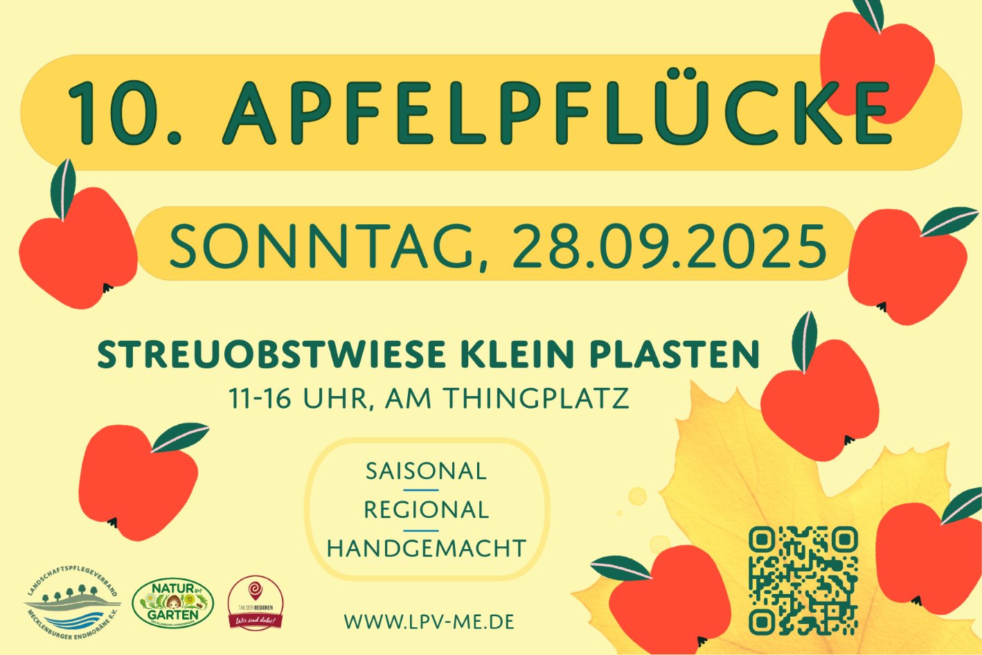 Für die Veranstaltung wird kein Eintritt erhoben. Der Erlös aus dem Verkauf von Äpfeln kommt dem Landschaftspflegeverband „Mecklenburger Endmoräne“ für die Vereinsarbeit im Sinne des Natur- und Umweltschutzes zugute.