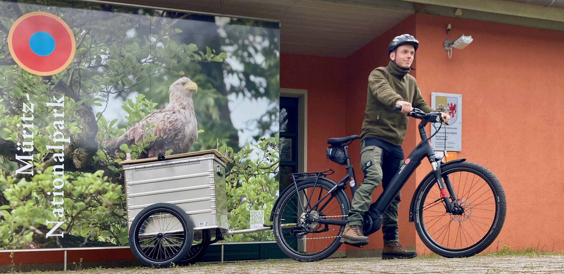 Bild: Ranger Lars de Wilde mit einem der zwei neuen Info-Fahrräder vor der Nationalparkinformation in Schwarzenhof.