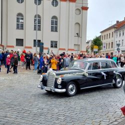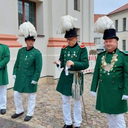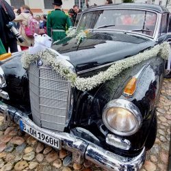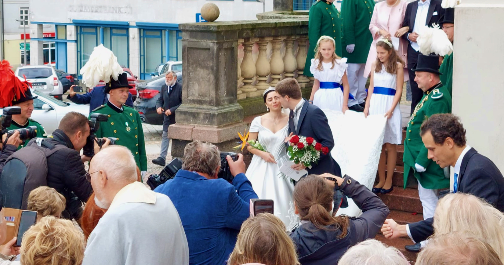 Mehrere hundert Schaulustige verfolgten die katholische Messe, in der auch eine Gedenkminute für die verstorbene britische Königin Elizabeth II. (1926-2022) eingelegt wurde. Eine Frau und ein Mann sangen zudem das „Ave Maria“ und das „Panis Angelicus“, was so manche Träne laufen ließ. Nach dem Auszug jubelten viele Neustrelitzer und Gäste dem Brautpaar zu.
