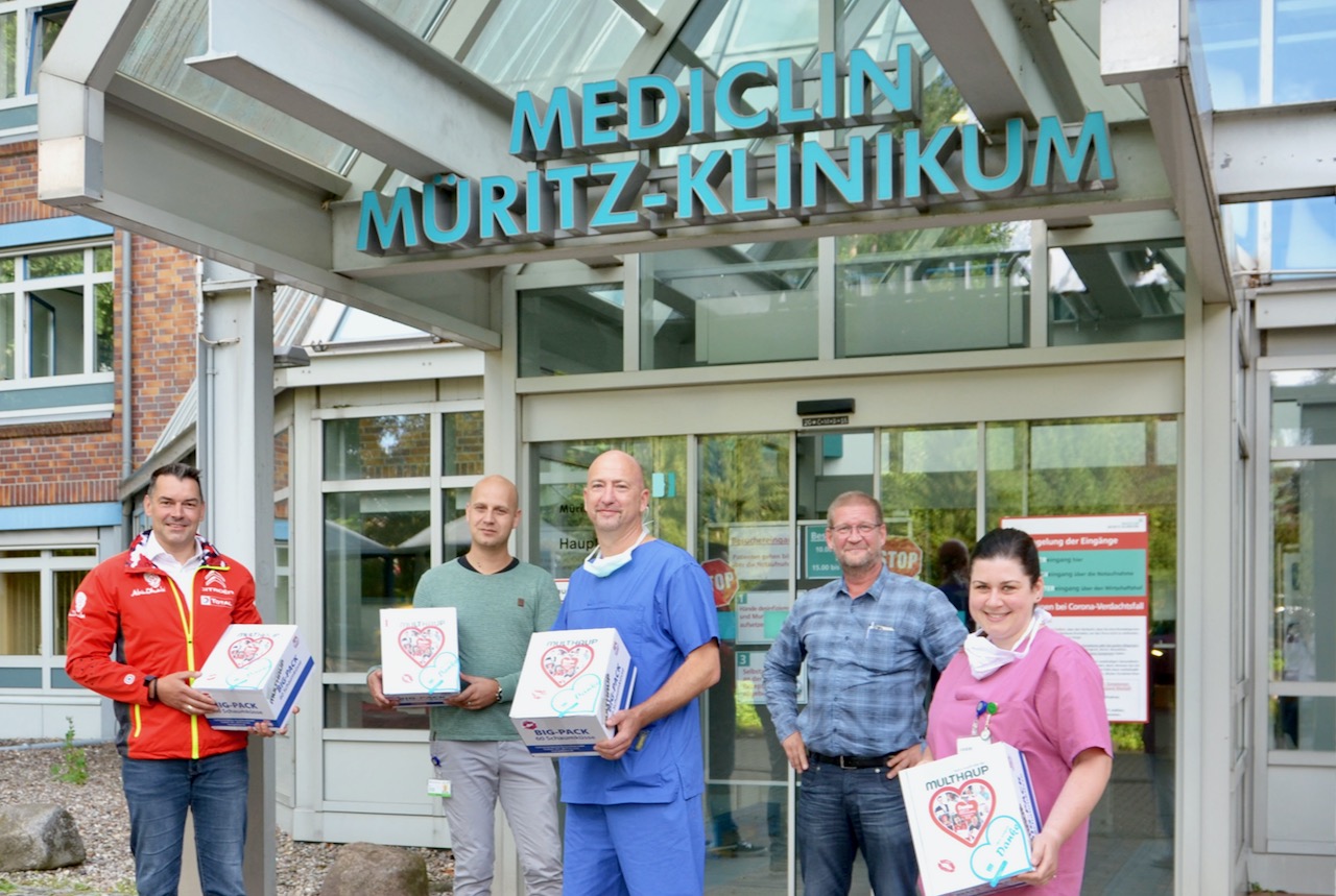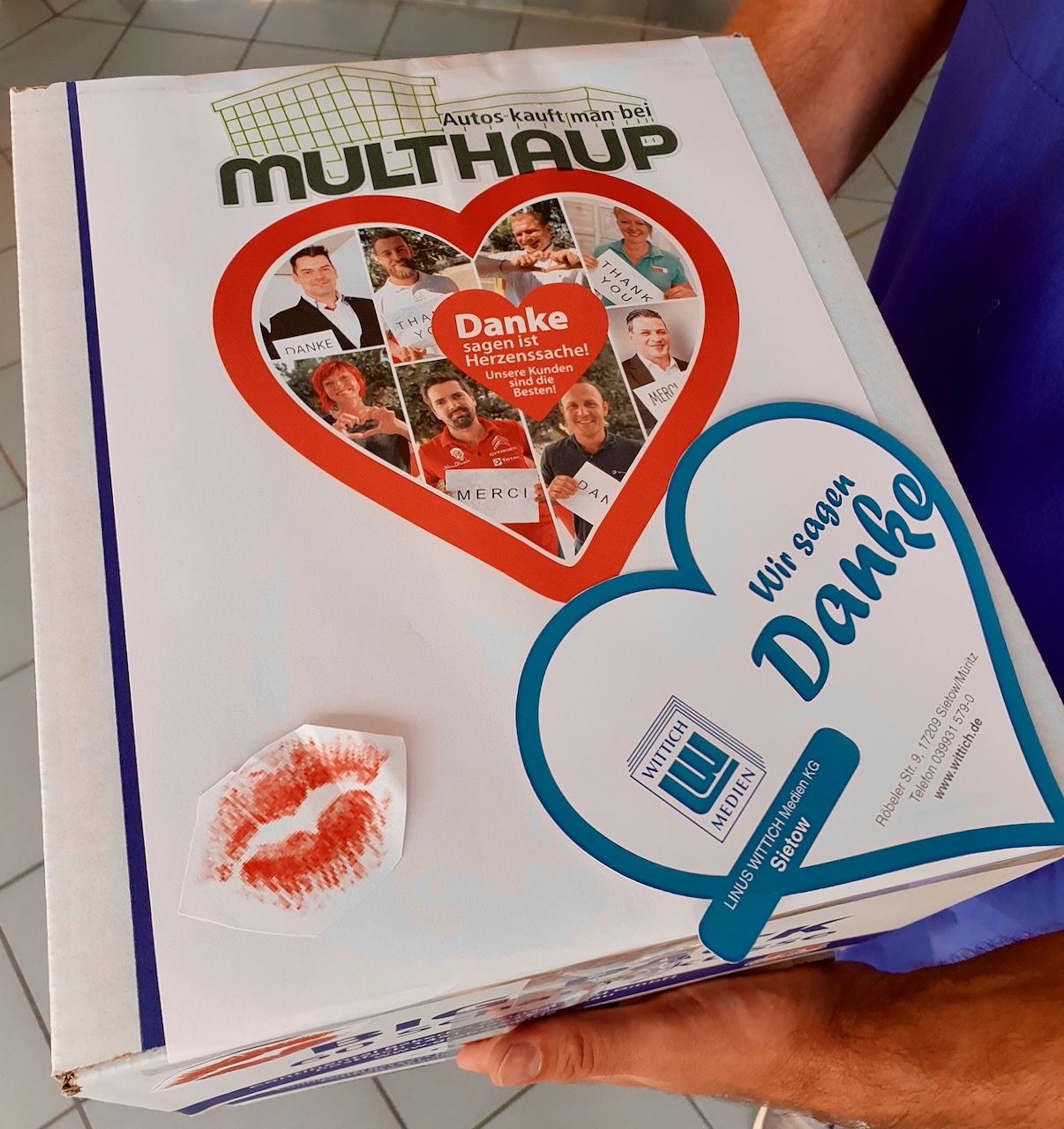 Eine wirklich tolle Geste: Heute am frühen Morgen haben Matthias Wolter, Betriebsleiter im Autohaus Multhaup, und Dirk Spyra, Mitarbeiter des Linus Wittich Verlags, die Mitarbeiter des MediClin Müritz-Klinikums mit 240 Schaumküssen versorgt – direkt und frisch aus Grabow