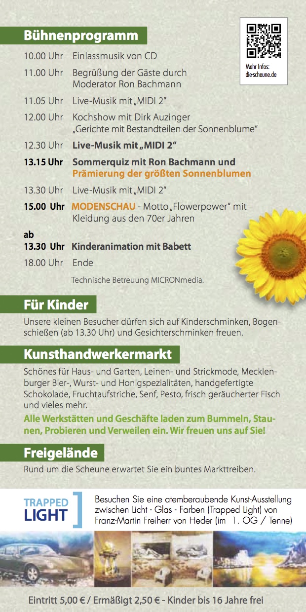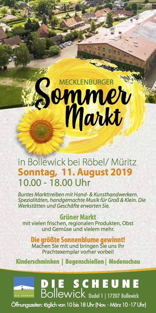 In Bollewick gibt es am kommenden Sonntag einen großen Sommermarkt mit tollem Programm. Von der Kochshow mit Dirk Auzinger über die Prämierung der größten Sonnenblume bis hin zur „Flowerpower“-Modenschau und viel Kinder-Spaß ist alles dabei.