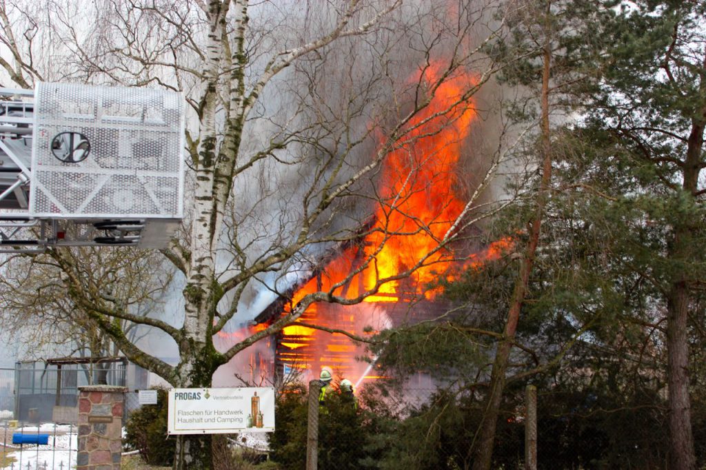 In der Scheune standen keine 52 Gasflaschen. Die Gasflaschen stand in einem gesicherten Metallkäfig (links auf dem Bild zu sehen) etwa 10 Meter von der Scheune entfernt untergebracht gewesen und konnten von dort sicher außer Reichweite gebracht werden. In der Scheune standen lediglich ein paar kleine 3L Gasflaschen, die da auch kein Feuerwehrmann mehr rausgeholt hat. Dafür stand die Scheune schon viel zu sehr in Flammen….