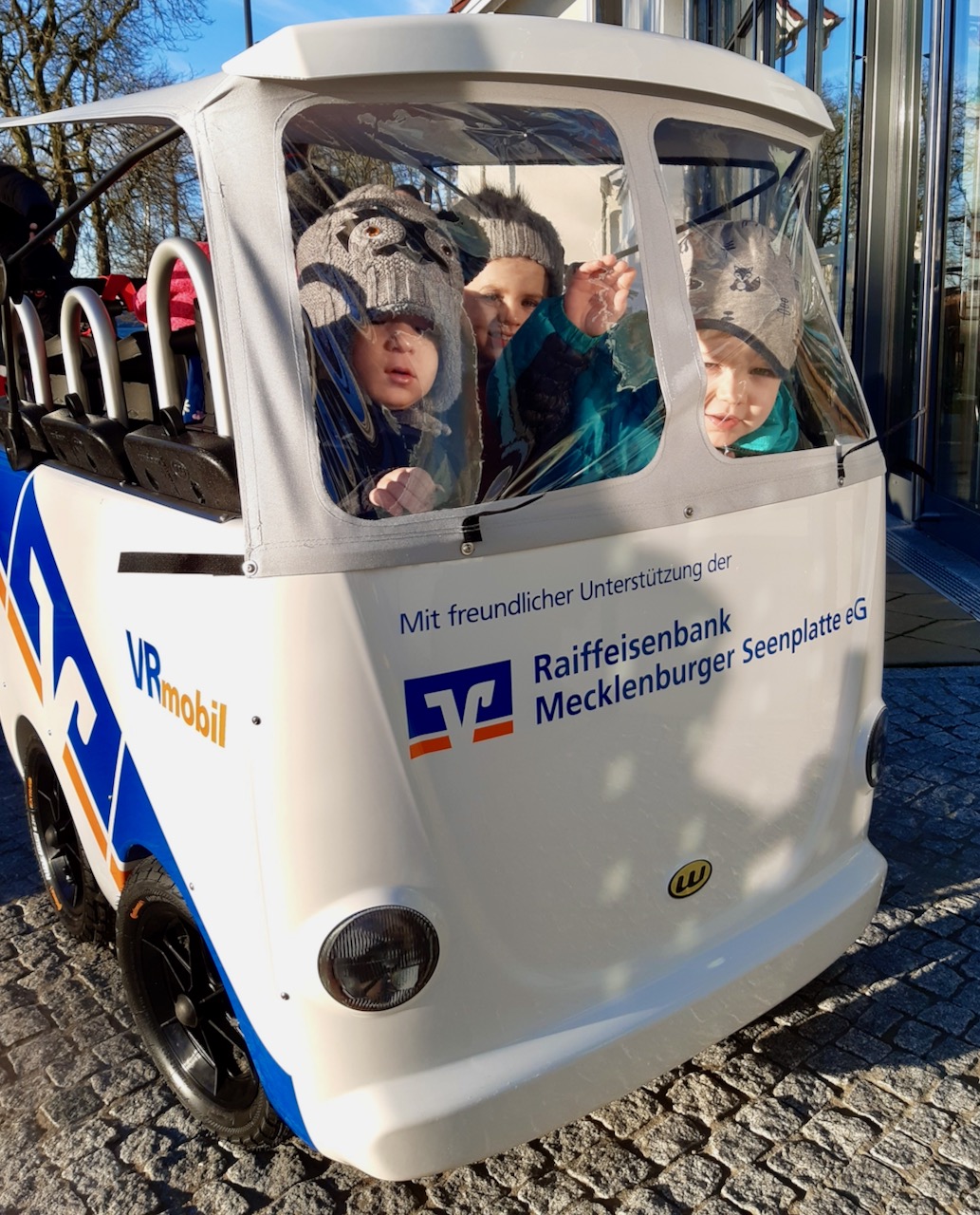 Sie fahren richtig ab auf ihren schicken Flitzer: Ende vergangenen Jahres hat sich die Raiffeisenbank Mecklenburger Seenplatte eG mit einem ganz besonderen Aufruf an Kindertagesstätten und Tagesmuttis in der Region gewandt. In zwei Filialen der Bank – in Waren und in Teterow – standen zwei nagelneue Kinderbusse für ihren Einsatz bereit. Unter dem Motto „Mitfahrer gesucht“ waren alle Kindereinrichtungen aufgerufen, sich um dieses VR-Mobil zu bewerben. Und: Es wurde kräftig gebastelt, gemalt und gereimt, so dass 36 kreative Bewerbungen bei der Bank eingereicht wurden.