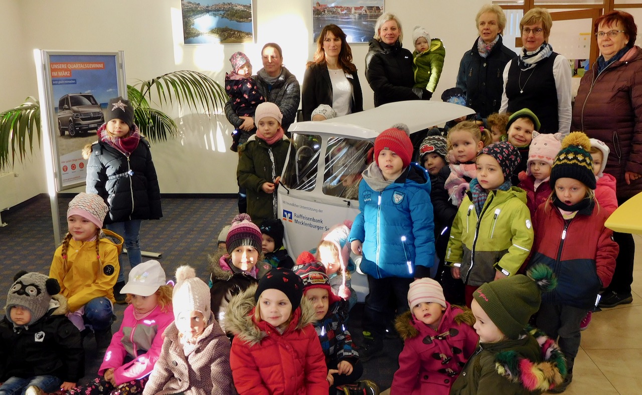 Vor wenigen Tagen war es dann so weit: Die Kinder der Kita „Tiefwarensee“ in Waren haben sich auf den Weg gemacht in die Hauptfiliale der Raiffeisenbank Mecklenburger Seenplatte in der Kietzstraße. Dort konnten sie ihr neues Mobil in Empfang nehmen. Zuerst wurde geschaut und vorsichtig getestet. Aber schnell war klar, welche sechs Kinder den Heimweg in ihre Kita nicht mehr zu Fuß, sondern jetzt bequem und sicher in ihrem neuen Kinderbus antreten werden.