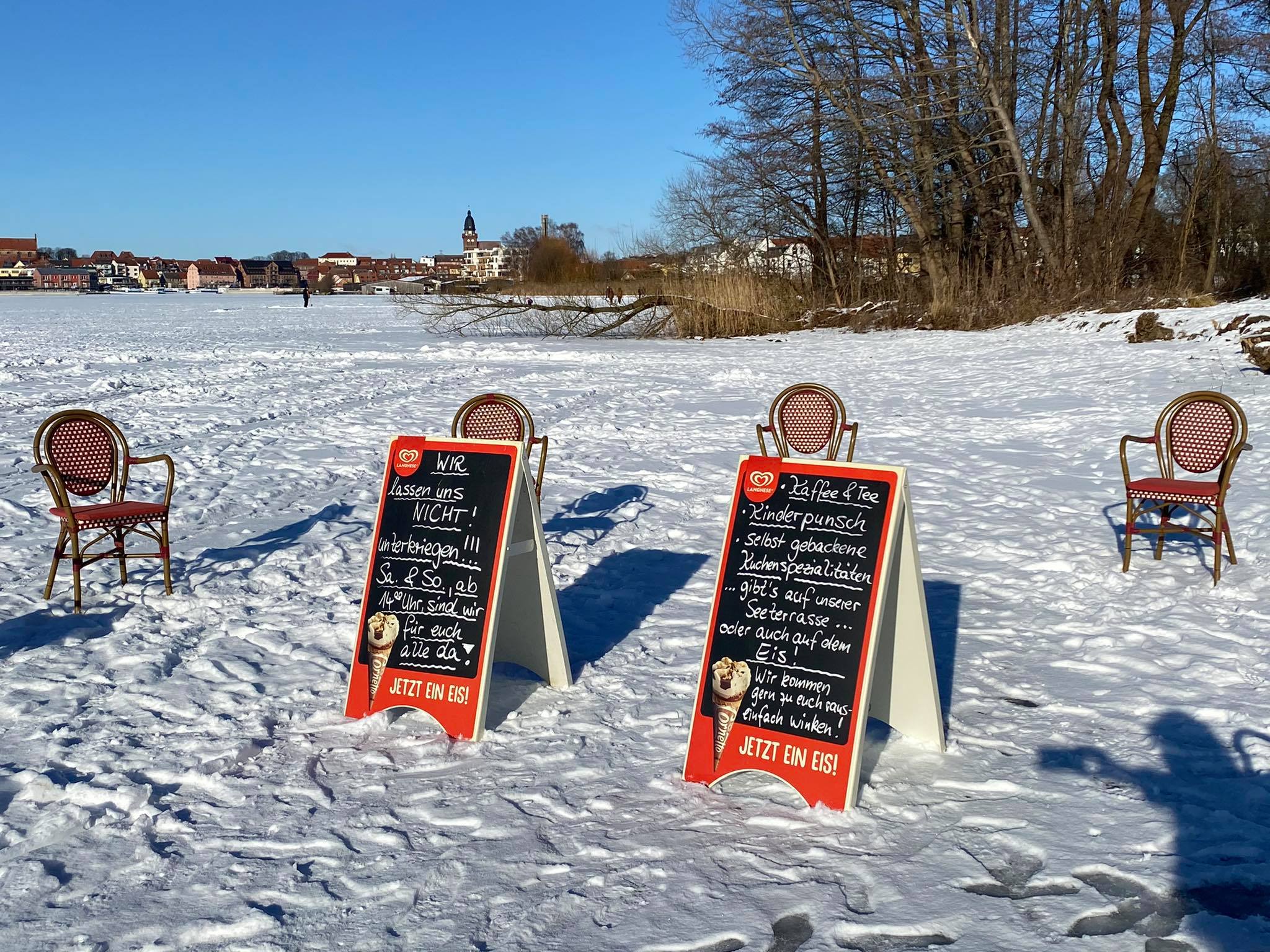 Coole Idee an kalten Tagen! Getreu dem Motto: „ Kampflos geben wir nicht auf!“, startet das „ FloMaLa“ am Warener Seeufer ab heute an jedem Winterwochenende diese „ fröhliche Versorgungsaktion“ für Spaziergänger.
