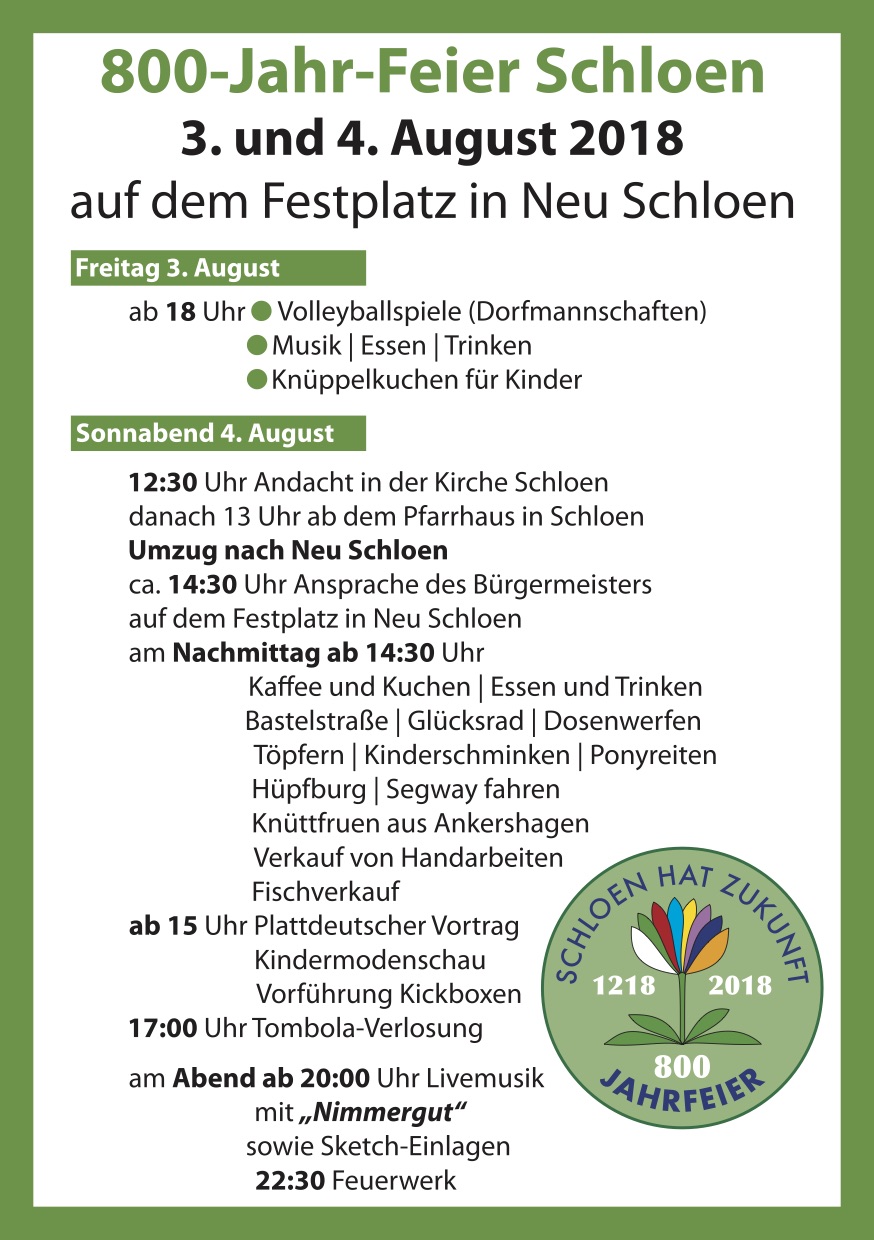 Wieder ein Glückwunsch heute früh: Wir gratulieren der Gemeinde Schloen. Sie feiert nämlich ab heute Abend den 800. Geburtstag des Dorfes, und das Programm kann sich wirklich sehen lassen.