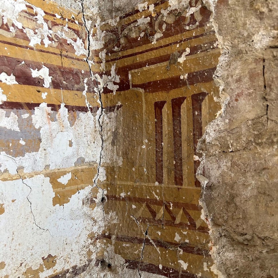 Die illusionistische Ausmalung der Nische stellt unter anderem so genannte Triglyphen dar, also senkrechte Rillendarstellung in Anlehnung an den Fries eines griechischen Tempels. Die Farbfassungen gehen von beige-sandfarbenem Untergrund über braunrote Schatten der Rillen hin zu weißen Zierelementen.
