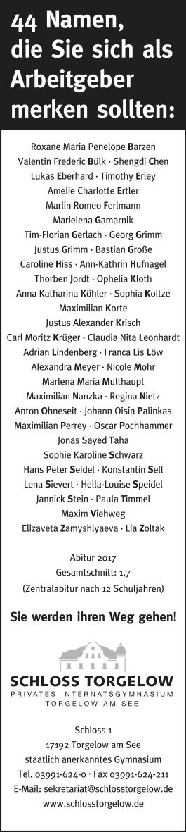 Traditionell ist der Abiturschnitt eines Abschlussjahrgangs das bestgehütete Geheimnis der Schulleiterin Heidrun Franke. In diesem Jahr hat sie es bei der Zeugnisverleihung besonders spannend gemacht. Ganz langsam öffnete sie den Umschlag mit dem Schnitt und verkündete dann voller Stolz: 1,7! Applaus brandete auf und dann wurde es plötzlich ganz leise: Den 300 Gästen war bewusst geworden, dass der Abiturjahrgang 2017 damit den besten Schnitt seit 1994, dem Gründungsjahr des privaten Internatsgymnasiums Schloss Torgelow bei Waren an der Müritz, erreicht hatte.