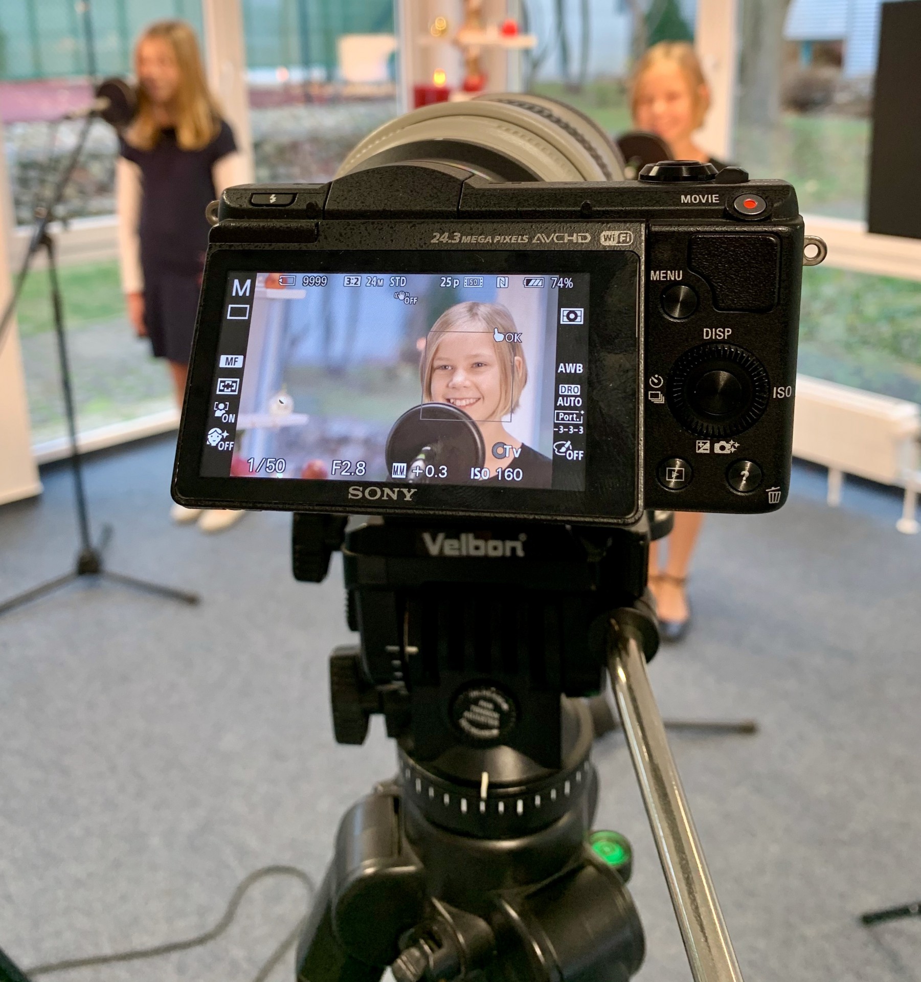 Bild rechts: Hulda und Eva, 5. Klasse, voller Freude beim Dreh ihres Musikbeitrages – das Türchen wird nicht verraten!