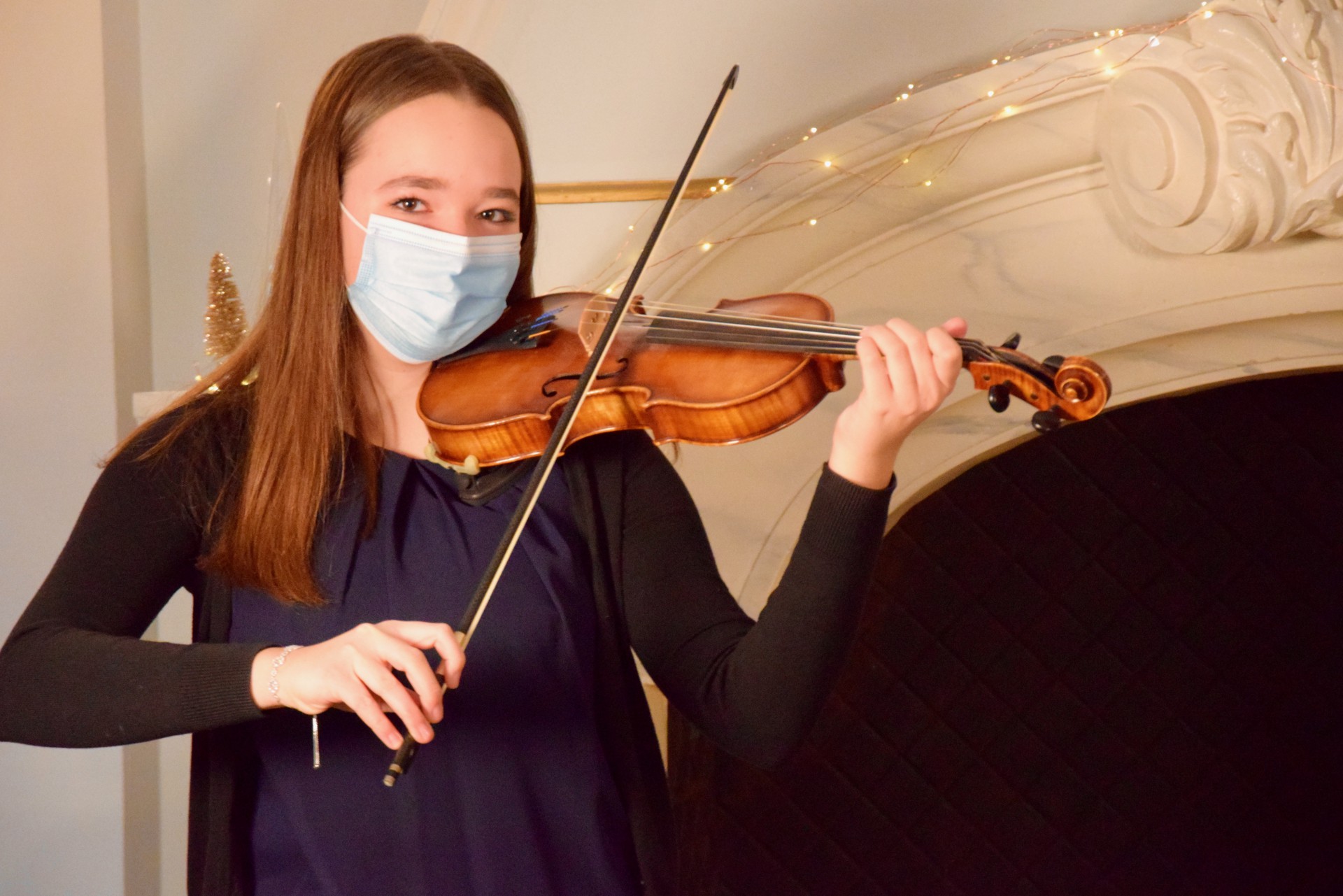 Bild links: Emilia, 12. Klasse, verzauberte uns beim Dreh mit ihrer Geige, sie wird im Schloss-Foyer zu sehen sein. In einem Meer aus Kerzen. Türchen? Über
