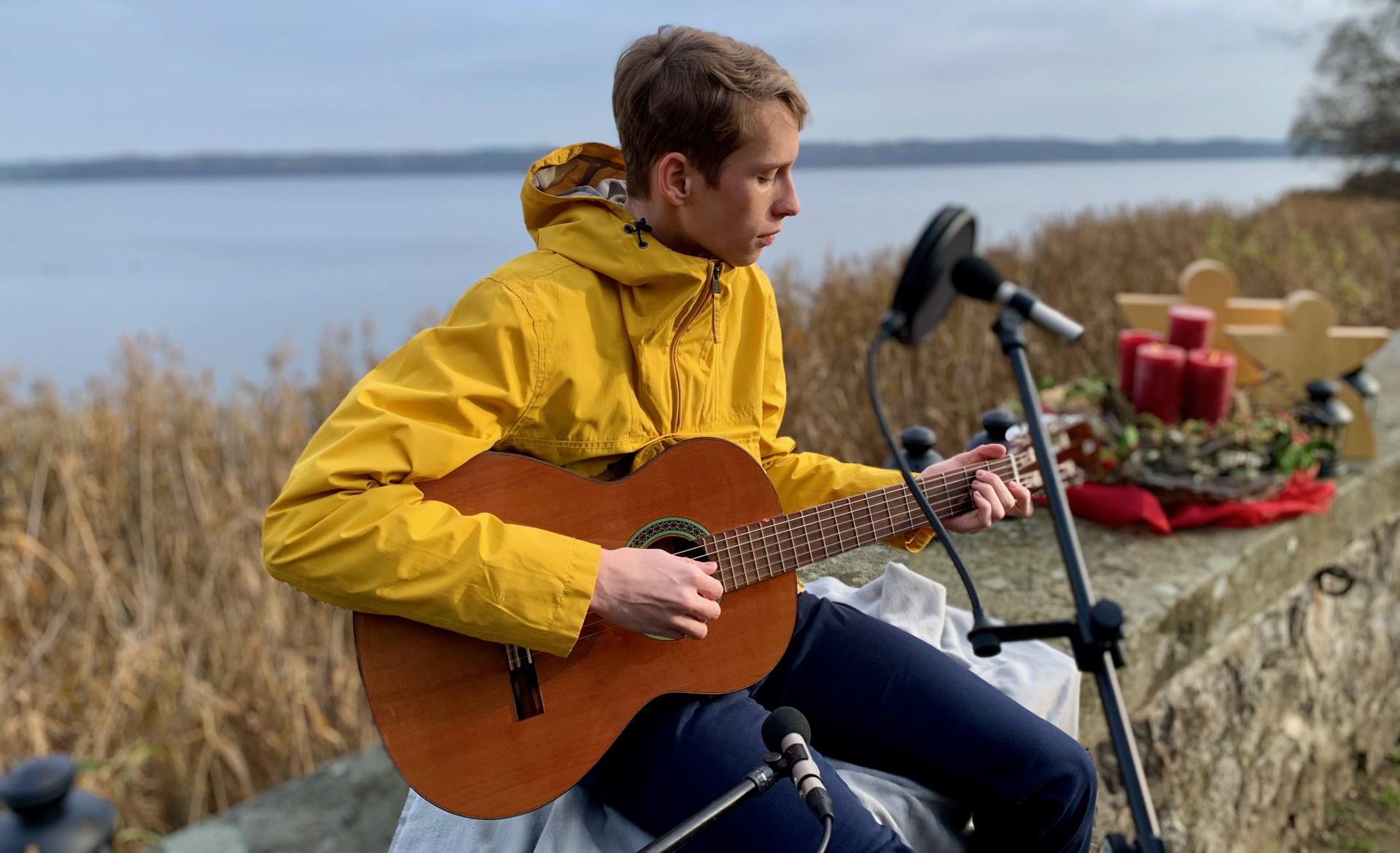 Bild oben: Manus, 12. Klasse, beim Dreh auf der Seemauer am Torgelower See: Gitarrenklänge, eine berührende Stimme und Natur pur.