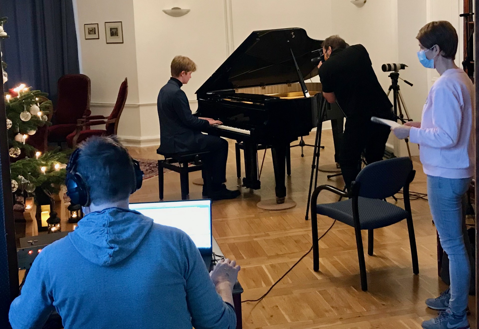 Bild unten: Jakob, 10. Klasse, beim Dreh seines Klavierstückes im Musikzimmer des Schlosses. Cooler Auftritt – nur wann?