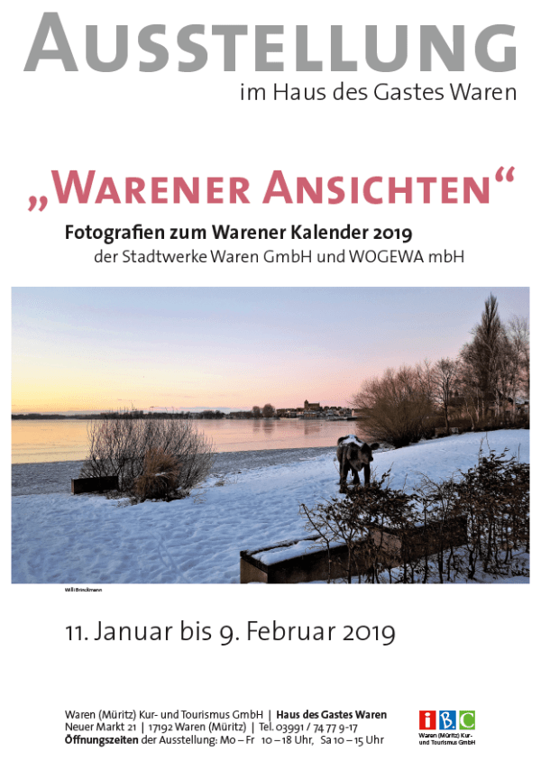 Seit vielen Jahren erscheint der beliebte „Warener Kalender“ mit Ansichten der Stadt Waren (Müritz), herausgegeben von der WOGEWA mbH und den Stadtwerken Waren GmbH. Für den Kalender 2019 bewarben sich 46 Fotografen mit ihren Bildern. Aber es können ja immer nur 13 Motive den Kalender schmücken. Daher ist es eine schöne Tradition geworden, das Jahr mit einer Ausstellung der Fotografien zu beginnen. Und diese Ausstellung wird heute Abend ab 19.30 Uhr im „Haus des Gastes“ in Waren eröffnet.