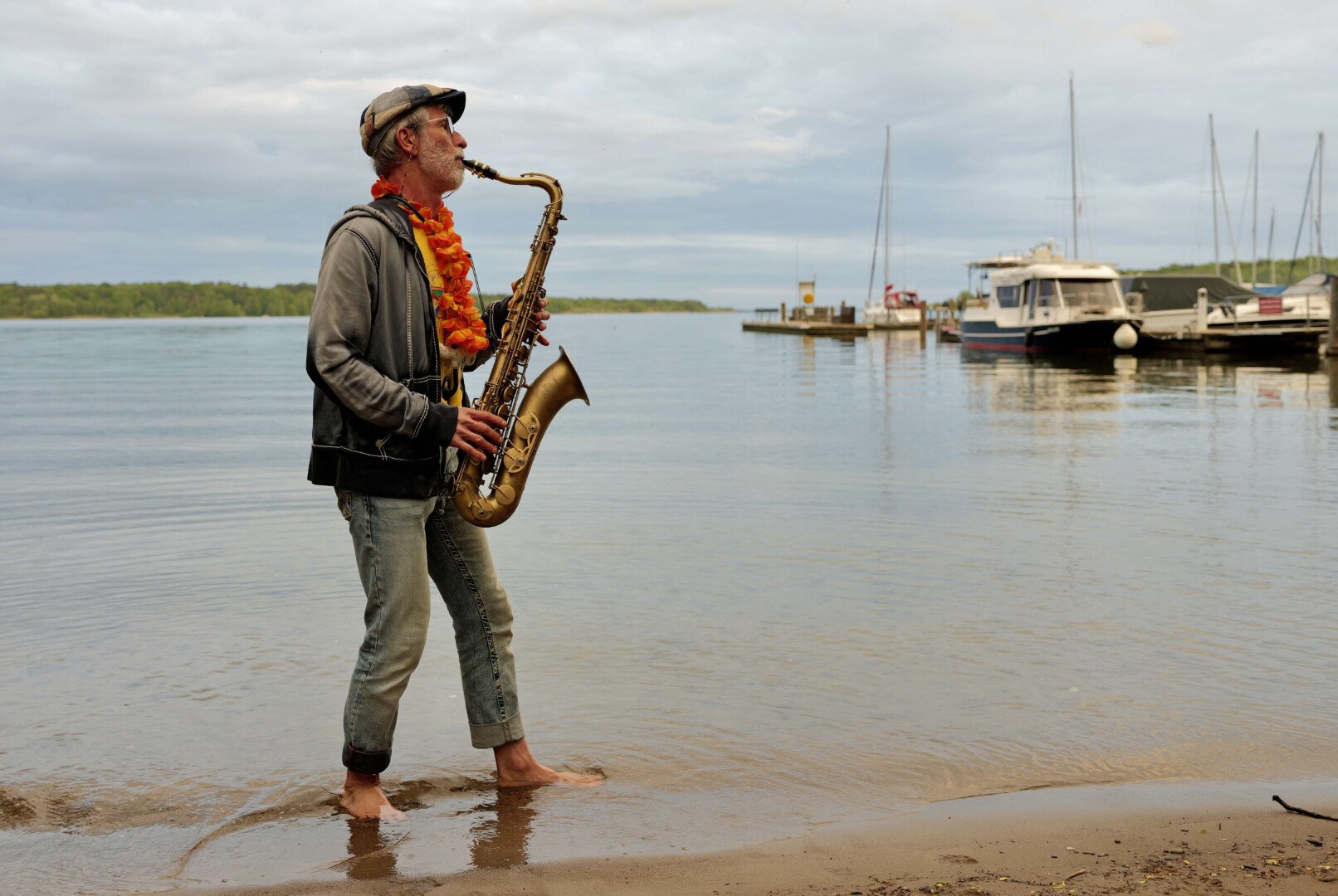 Ein bisschen Karibik-Flair an der Müritz: Ein Saxophonist spielt barfuß am Ufer der Müritz mit Blick auf den kleinen Hafen in Kamerun bei Waren. Ein stiller, schöner Moment voller Musik, Leichtigkeit und Sommergefühl. In diesem Sinne wünschen wir allen Müritzern und Gästen ein traumhaftes Wochenende!