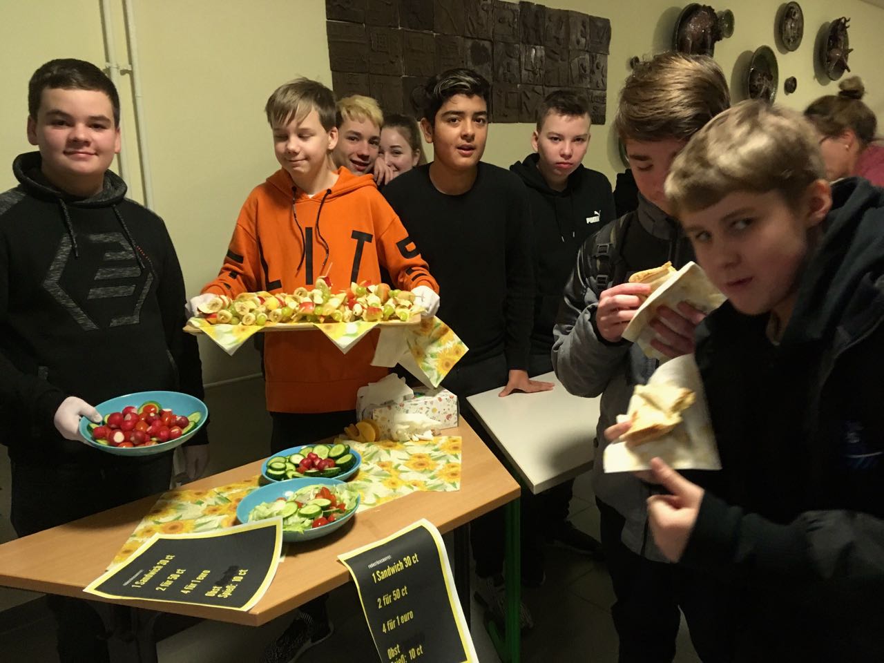 Daumen hoch für diesen Einsatz.Nachdem die „Warener Tafel“ das „gesunde Frühstück“ an drei Warener Schulen gestrichen hat (WsM berichtete), wollen es die Jugendlichen der Friedrich-Dethloff-Schule selbst in die Hand nehmen. Heute hat die Klasse 7R2 das Frühstück zubereitet und konnte sich vor hungrigen Kunden kaum retten. Ruckzuck war alles weggeputzt.