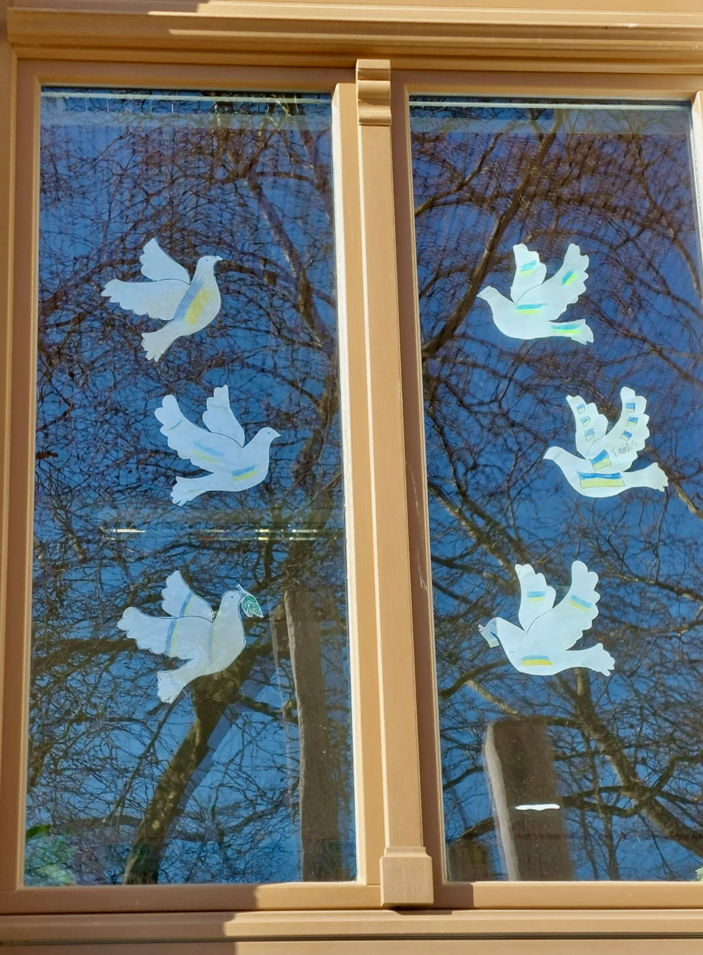 Im Anschluss wollten sie unbedingt ein Zeichen setzen und haben Friedenstauben gebastelt, die jetzt am Fenster ihres Klassenraumes zu sehen sind.