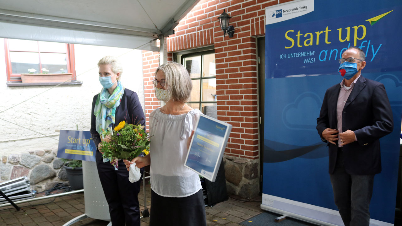 Die Entscheidung ist gefallen: Luise Beaumont aus Freidorf bei Penzlin ist die Siegerin des Gründerinnen-Wettbewerbs „Start up and fly“, den die IHK Neubrandenburg für das östliche Mecklenburg-Vorpommern im März ausgerufen hatte. Die Siegerin hat neben einer eigens gefertigten Skulptur, Urkunde und Blumen auch das ausgeschriebene Preisgeld in Höhe von 3.000 Euro erhalten. Mit Marion Eschenbach kommt auch eine Zweitplatzierte des Wettbewerbs aus der Mecklenburgischen Seenplatte.