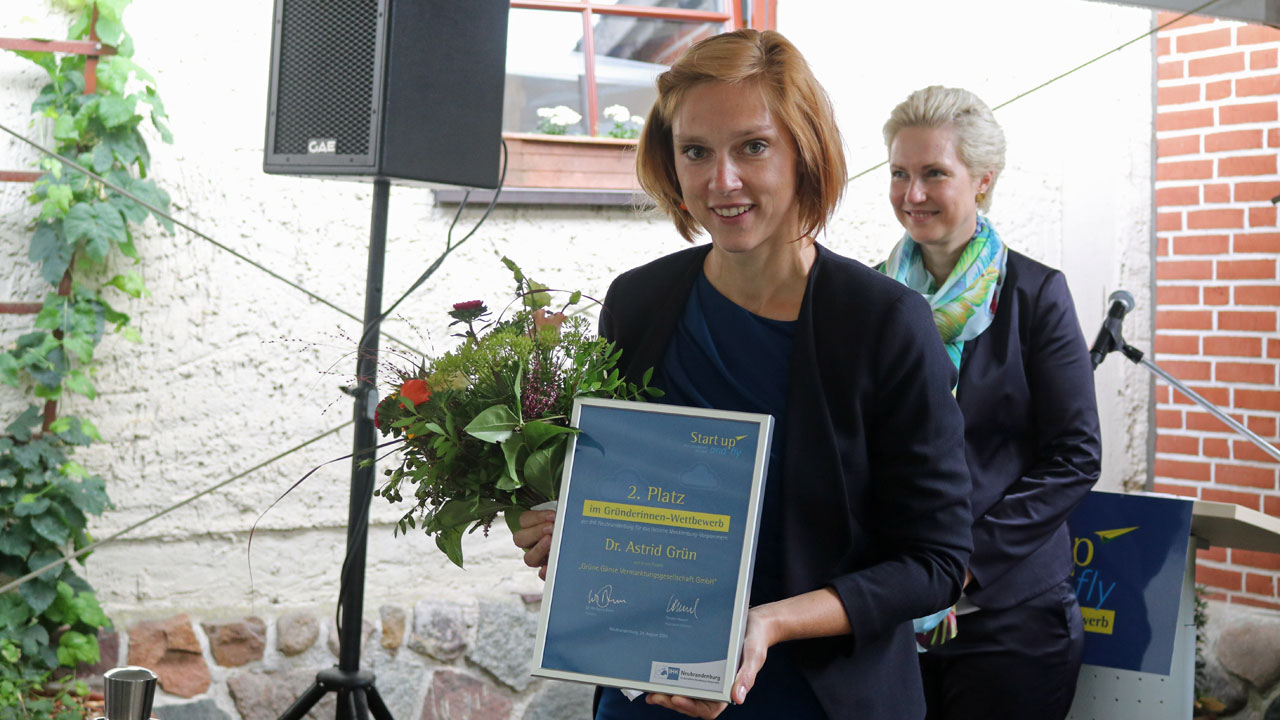 Geehrt wurden auch die beiden Zweitplatzierten im Gründerinnen-Wettbewerb: In Wustrow bei Neubrandenburg baut Marion Eschenbach mit ihrer VenusZauber am See GmbH ein Feriendorf mit innovativen Unterkünften auf. Die Kugelhäuser werden ausschließlich in ökologischer Holzbauweise errichtet.