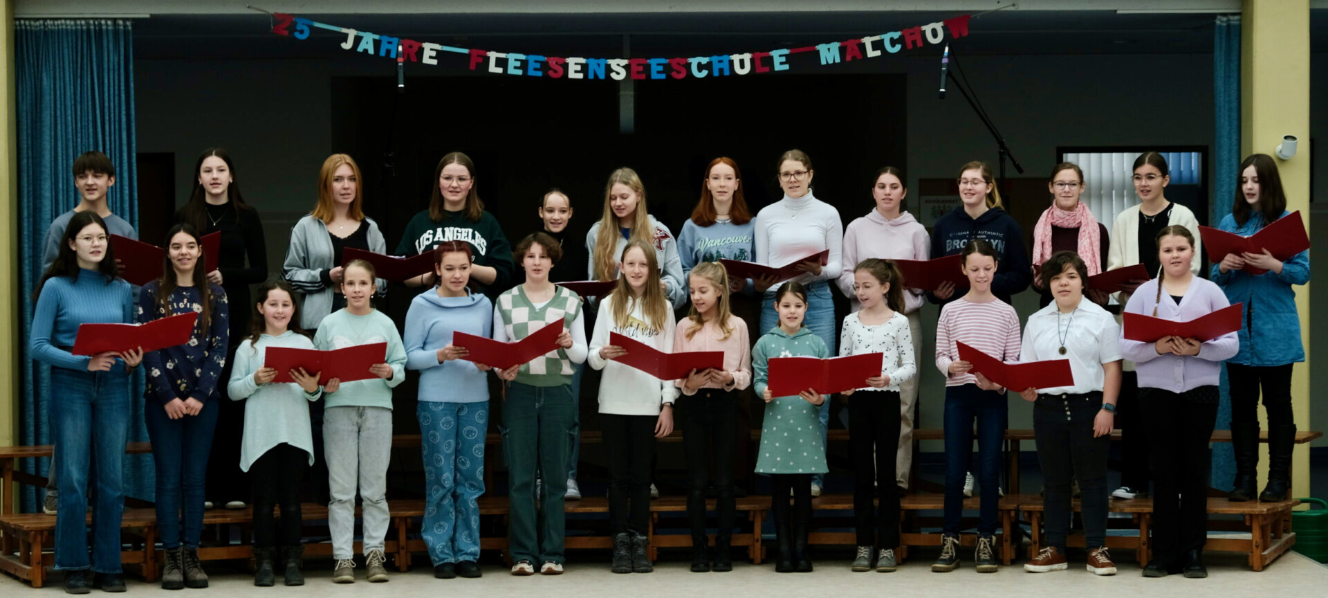Eröffnet wurde die Veranstaltung durch die Schulleiterin und den Schulchor, der mit Frau Adel den Auftakt gab und durch die Schulfunker unterstützt wurde. Anschließend hielten Sarah und Benjamin aus der G9 eine kurze Rede.