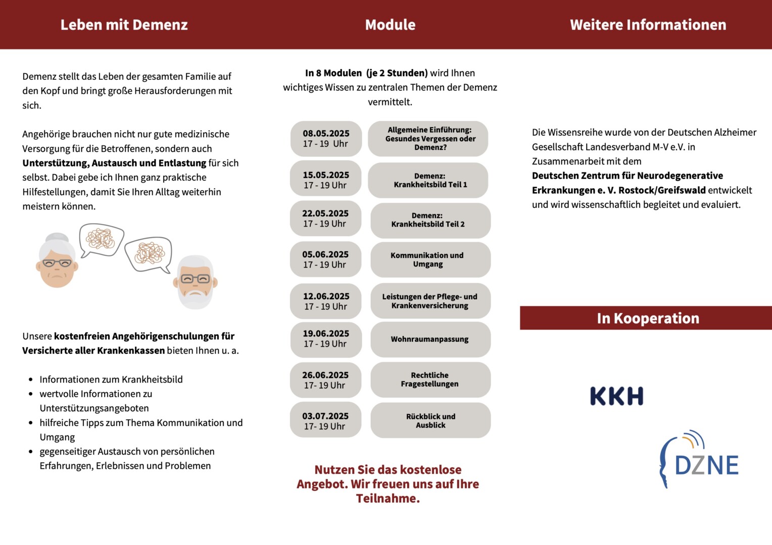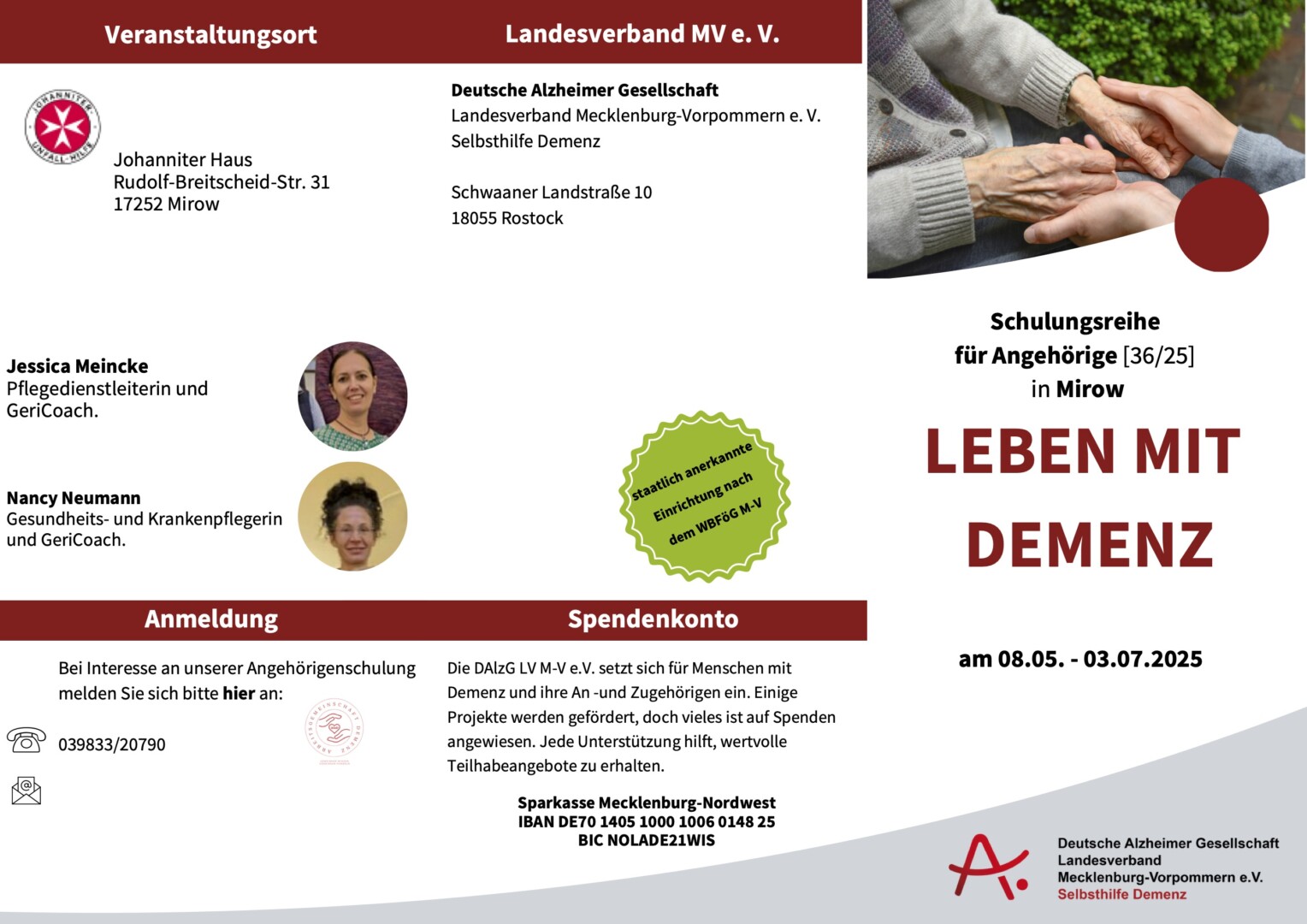 Demenz stellt das Leben der gesamten Familie auf den Kopf und bringt große Herausforderungen mit sich. Angehörige brauchen nicht nur gute medizinische Versorgung für die Betroffenen, sondern auch Unterstützung, Austausch und Entlastung für sich selbst. In Mirow startet am 8. Mai um 17 Uhr wieder eine kostenfreie Schulung für Angehörige. An acht Terminen jeweils donnerstags zwischen 17-19 Uhr werden Informationen zum Krankheitsbild, Unterstützungsangebote, hilfreiche Tipps für Kommunikation und Umgang vermittelt. Dabei kommt auch der Austausch mit anderen Betroffenen nicht zu kurz. Es gibt noch freie Plätze. Mehr Informationen und Anmeldung unter Telefon 039833/20790.