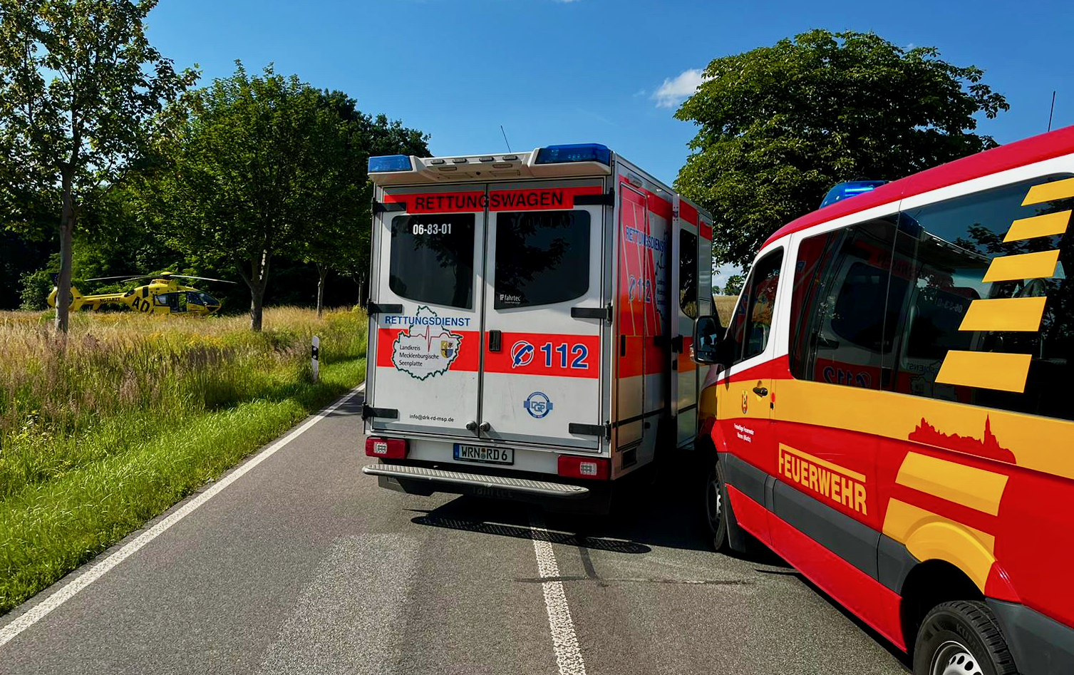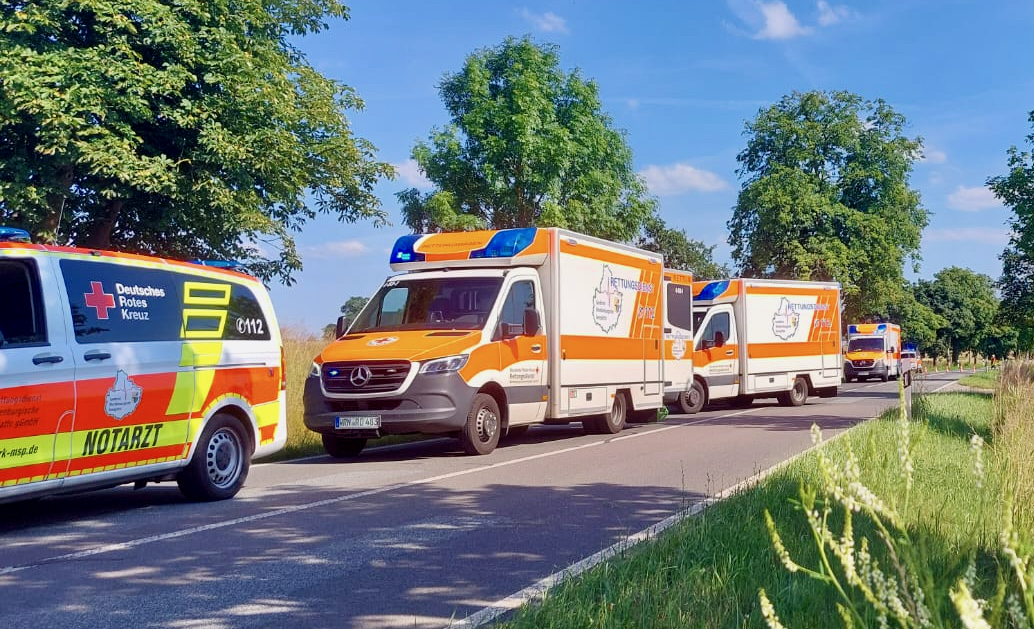 Großer Rettungseinsatz heute Nachmittag auf der Straße zwischen Waren und Jägerhof: Bei einem Unfall, an dem drei Autos beteiligt waren, wurden zwei Menschen schwer verletzt. Neben Rettungswagen, Polizei und Feuerwehr landeten auch zwei Hubschrauber. Laut Polizei setzte ein 45-jährige Nissan-Fahrer zum Überholen an und wollte den vor ihm fahrenden Opel eines 59-jährigen Fahrzeugführers überholen. Dabei beachtete er nicht, dass er von dem hinter ihm fahrenden 45-jährige Fahrer eines Pkw Ssang Yong bereits überholt wurde.