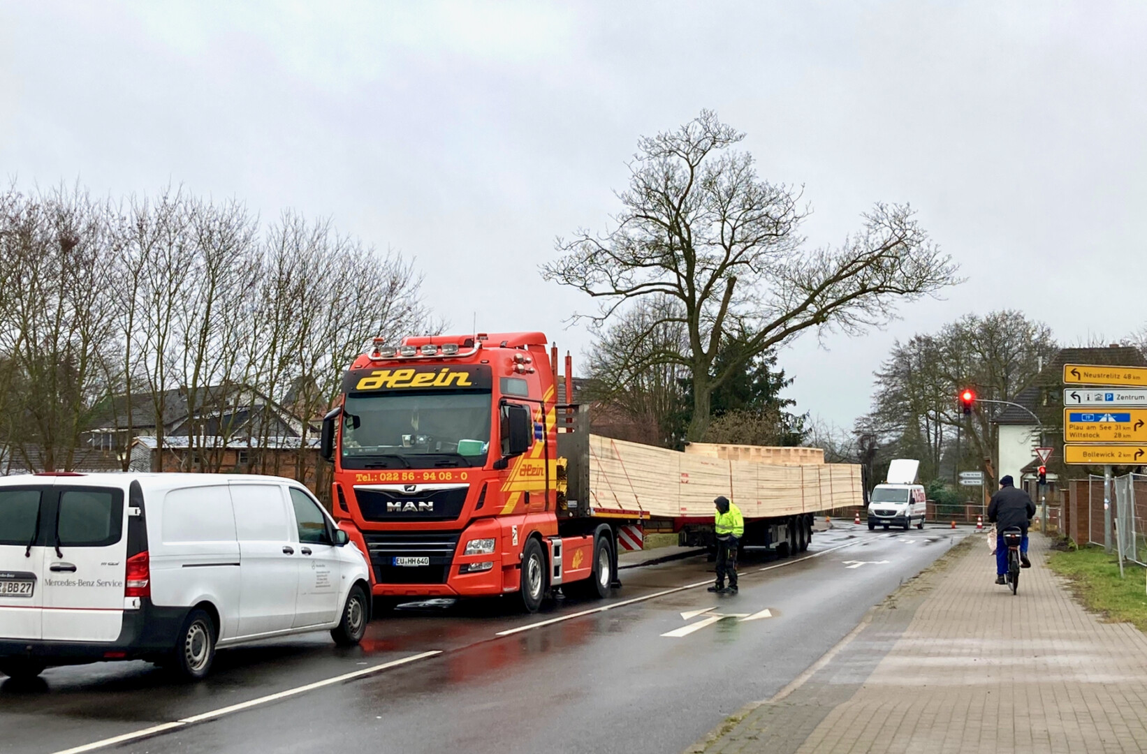 Im Bereich der Röbeler Umgehungsstraße ist in der letzten Nacht ein Schwerlaster stehen geblieben. Als Ursache nennt die Polizei einen technischen Defekt. Der rund 33 Meter lange Laster hat 16 Tonnen Holz für den neuen Norma-Markt in Waren geladen. Aber selbst wenn die Reparatur schnell über die Bühne geht – die Straße bleibt den ganzen Tag über gesperrt, denn der Schwerlaster darf erst am späten Abend gegen 22 Uhr wieder los fahren.
