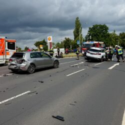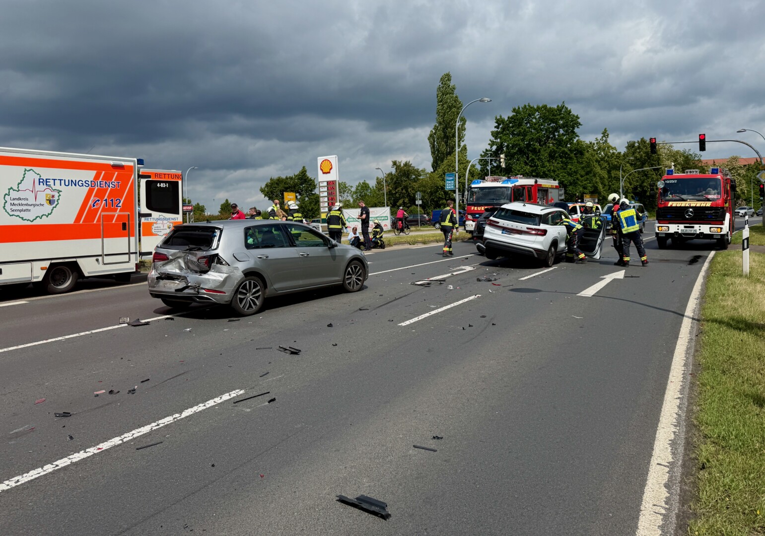 Bei einem Unfall heute gegen 13.30 Uhr auf der B 192 in Höhe der Shell-Tankstelle Waren-West sind sechs Menschen, darunter auch Kinder, leicht verletzt worden. Nach Informationen der Polizei fuhr ein 55-Jähriger mit seinem Skoda zunächst mit erheblicher Geschwindigkeit auf einen vorausfahrenden Wagen. In der Folge lenkte der Unfallverursacher nach links und kollidierte mit noch zwei weiteren Autos. Die Polizei geht derzeit davon aus, dass der Verursacher gesundheitliche Probleme hatte. Sechs Personen im Alter zwischen 9 und 67 Jahren wurden leicht verletzt und ambulant im Krankenhaus behandelt. Drei der beteiligten Fahrzeuge waren durch den Unfall nicht mehr fahrbereit. Die Bundesstraße musste für ca. 75 Minuten voll gesperrt werden. Die Polizei leitete den Verkehr über das Gelände der Tankstelle um, so das größere Staus ausblieben.